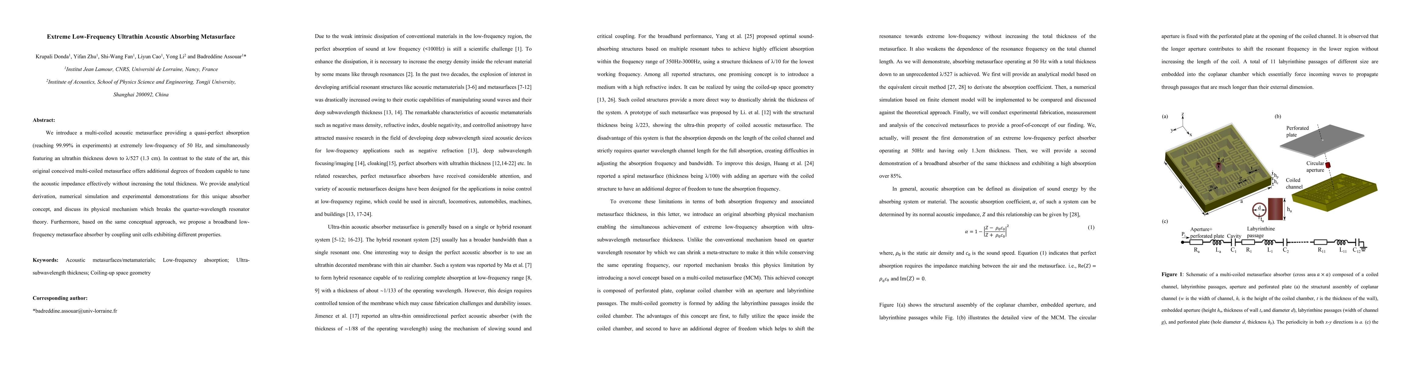 This paper presents a novel multi-coiled acoustic metasurface achieving quasi-perfect absorption (99.99%) at 50 Hz while maintaining an ultrathin thickness of 1.3 cm. This design offers tunable acoustic impedance without increasing thickness, breaking traditional quarter-wavelength resonator theory.
