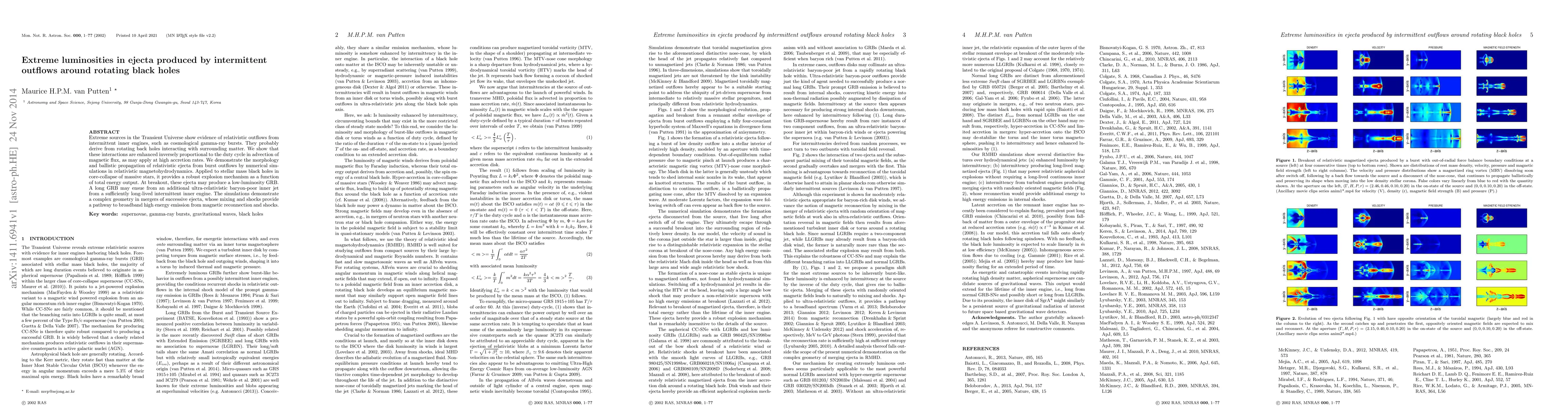 This paper explores the extreme luminosities in ejecta from intermittent outflows around rotating black holes, demonstrating enhanced interactions inversely proportional to the duty cycle in advection of magnetic flux. Numerical simulations reveal the morphology and ballistic propagation of relativistic ejecta, providing a robust mechanism for low-luminosity GRBs and potentially long GRBs from ultra-relativistic jets.