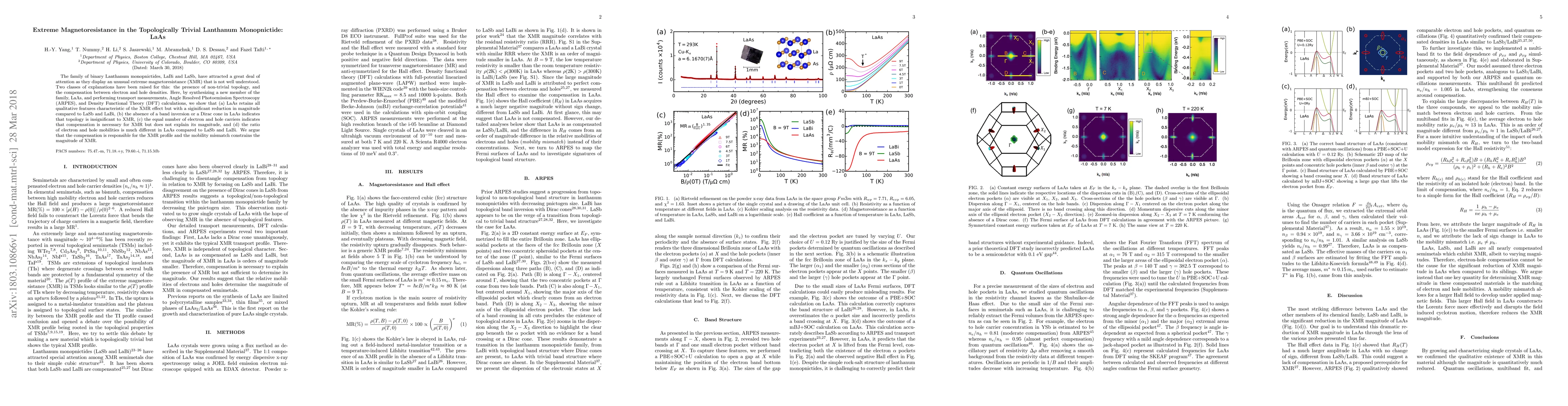 The family of binary Lanthanum monopnictides, LaBi and LaSb, have attracted a great deal of attention as they display an unusual extreme magnetoresistance (XMR) that is not well understood. Two classes of explanations have been raised for this: the presence of non-trivial topology, and the compensation between electron and hole densities. Here, by synthesizing a new member of the family, LaAs, and performing transport measurements, Angle Resolved Photoemission Spectroscopy (ARPES), and Density Functional Theory (DFT) calculations, we show that (a) LaAs retains all qualitative features characteristic of the XMR effect but with a siginificant reduction in magnitude compared to LaSb and LaBi, (b) the absence of a band inversion or a Dirac cone in LaAs indicates that topology is insignificant to XMR, (c) the equal number of electron and hole carriers indicates that compensation is necessary for XMR but does not explain its magnitude, and (d) the ratio of electron and hole mobilities is much different in LaAs compared to LaSb and LaBi. We argue that the compensation is responsible for the XMR profile and the mobility mismatch constrains the magnitude of XMR.