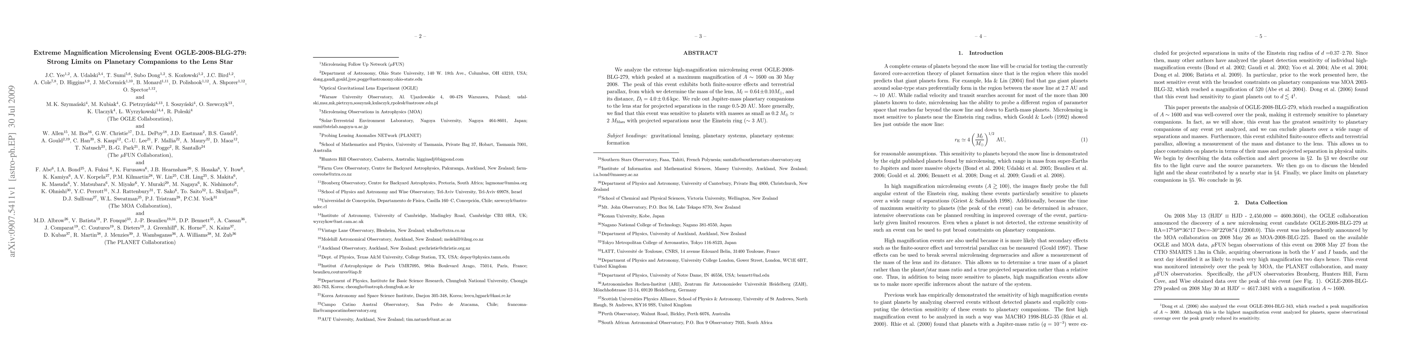 The OGLE-2008-BLG-279 microlensing event strongly limits the presence of Jupiter-mass planetary companions to a lens star at projected separations of 0.5-20 AU. It also suggests the existence of smaller planet masses with orbital distances near the Einstein ring (~3 AU).