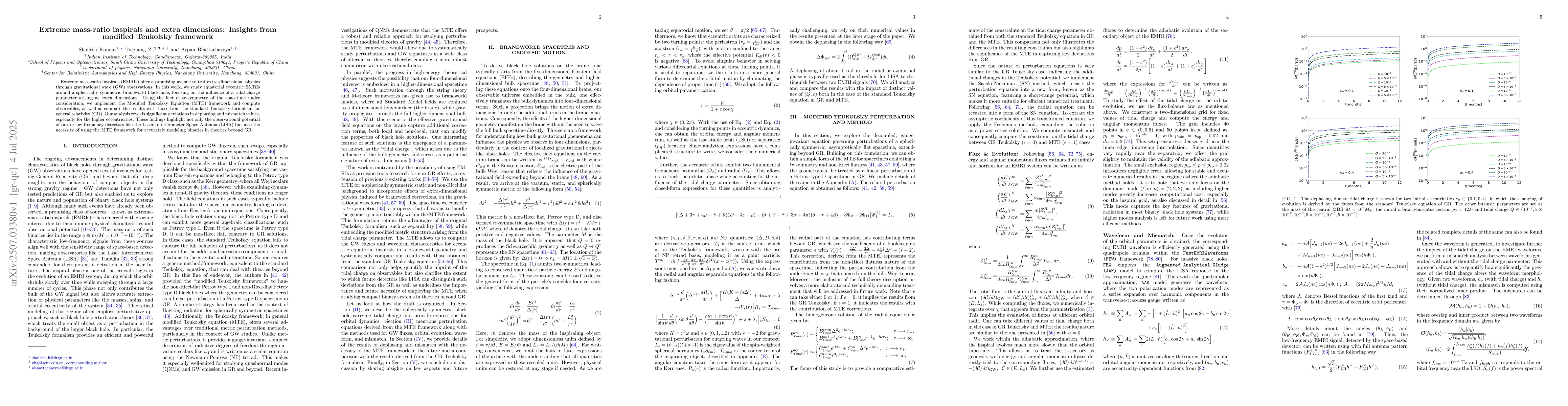 Extreme mass-ratio inspirals (EMRIs) offer a promising avenue to test extra-dimensional physics through gravitational wave (GW) observations. In this work, we study equatorial eccentric EMRIs around a spherically symmetric braneworld black hole, focusing on the influence of a tidal charge parameter arising as extra dimensions. Using the fact of tr-symmetry of the spacetime under consideration, we implement the Modified Teukolsky Equation (MTE) framework and compute observables, as well as compare the results with those from the standard Teukolsky formalism for general relativity (GR). Our analysis reveals significant deviations in dephasing and mismatch values, especially for the higher eccentricities. These findings highlight not only the observational potential of future low-frequency detectors like the Laser Interferometer Space Antenna (LISA) but also the necessity of using the MTE framework for accurately modeling binaries in theories beyond GR.