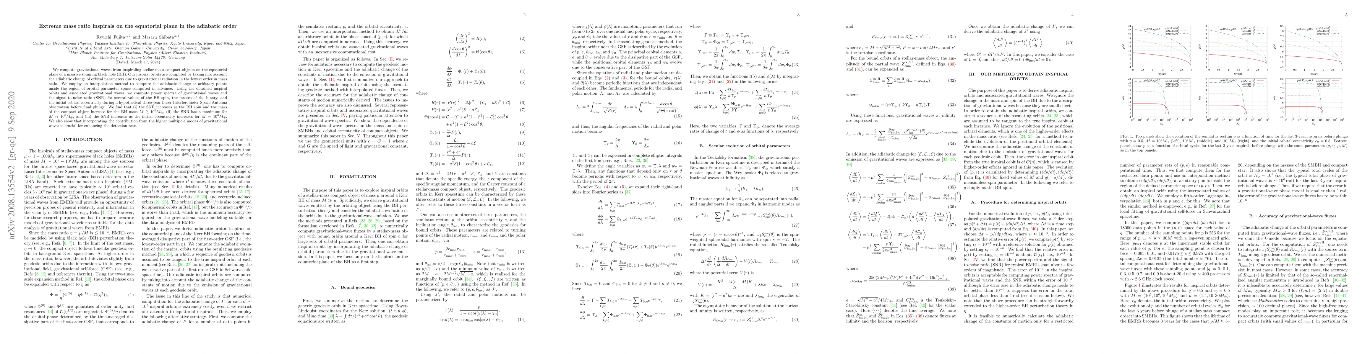 We compute gravitational waves from inspiraling stellar-mass compact objects on the equatorial plane of a massive spinning black hole (BH). Our inspiral orbits are computed by taking into account the adiabatic change of orbital parameters due to gravitational radiation in the lowest order in mass ratio. We employ an interpolation method to compute the adiabatic change at arbitrary points inside the region of orbital parameter space computed in advance. Using the obtained inspiral orbits and associated gravitational waves, we compute power spectra of gravitational waves and the signal-to-noise ratio (SNR) for several values of the BH spin, the masses of the binary, and the initial orbital eccentricity during a hypothetical three-yrs LISA observation before final plunge. We find that (i) the SNR increases as the BH spin and the mass of the compact object increase for the BH mass $M \agt 10^6M_\odot$, (ii) the SNR has a maximum for $M \approx 10^6M_\odot$, and (iii) the SNR increases as the initial eccentricity increases for $M=10^6M_\odot$. We also show that incorporating the contribution from the higher multipole modes of gravitational waves is crucial for enhancing the detection rate.