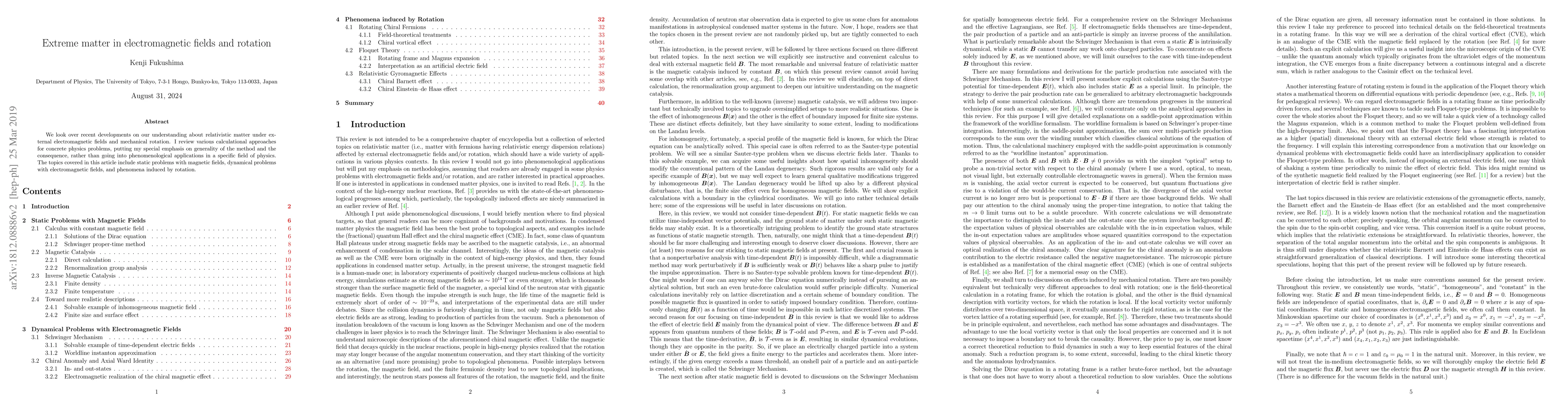 This paper reviews recent advancements in understanding relativistic matter under electromagnetic fields and rotation, focusing on general calculational methods and their consequences, covering static magnetic fields, dynamic electromagnetic fields, and rotational effects.