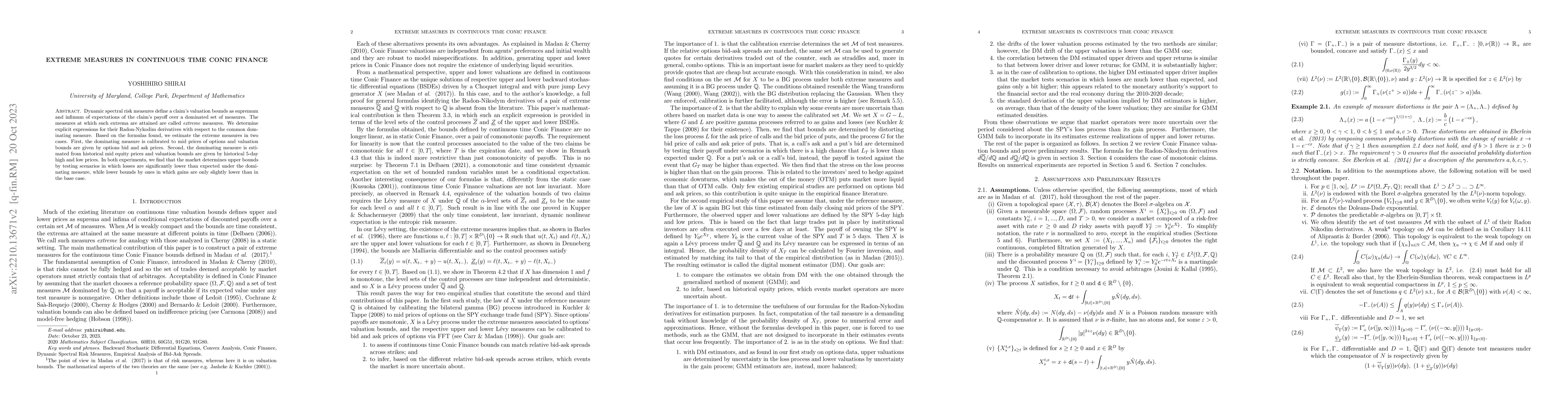 This paper investigates dynamic spectral risk measures in continuous time conic finance, determining explicit expressions for extreme measures' Radon-Nykodim derivatives. The study estimates these measures in two scenarios: one using option prices and another using historical equity prices, revealing that markets set upper bounds by scenarios with unexpectedly low losses and lower bounds by scenarios with slightly lower gains.