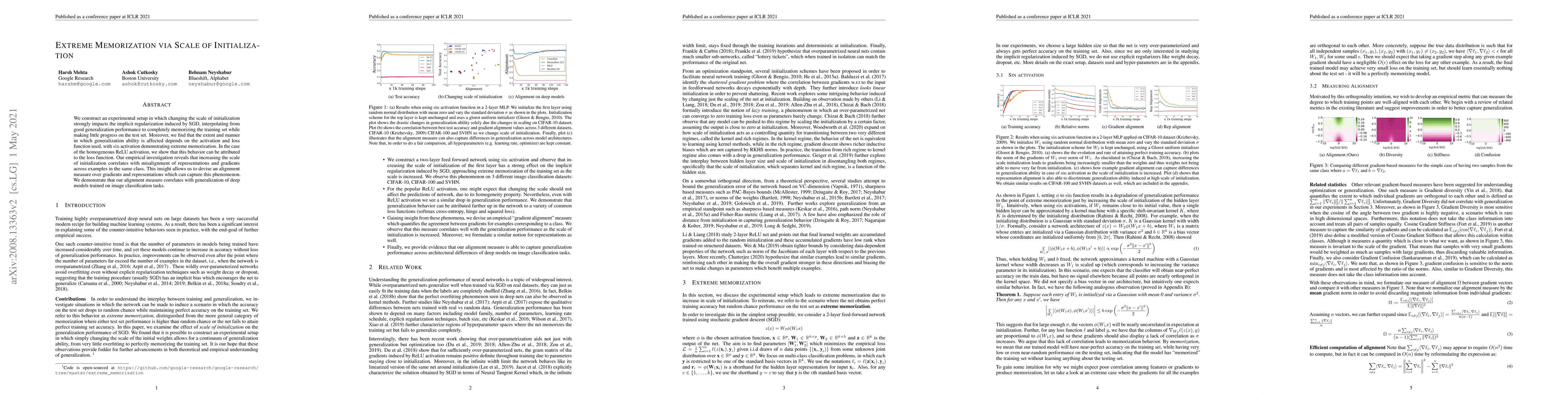 We construct an experimental setup in which changing the scale of initialization strongly impacts the implicit regularization induced by SGD, interpolating from good generalization performance to completely memorizing the training set while making little progress on the test set. Moreover, we find that the extent and manner in which generalization ability is affected depends on the activation and loss function used, with $\sin$ activation demonstrating extreme memorization. In the case of the homogeneous ReLU activation, we show that this behavior can be attributed to the loss function. Our empirical investigation reveals that increasing the scale of initialization correlates with misalignment of representations and gradients across examples in the same class. This insight allows us to devise an alignment measure over gradients and representations which can capture this phenomenon. We demonstrate that our alignment measure correlates with generalization of deep models trained on image classification tasks.