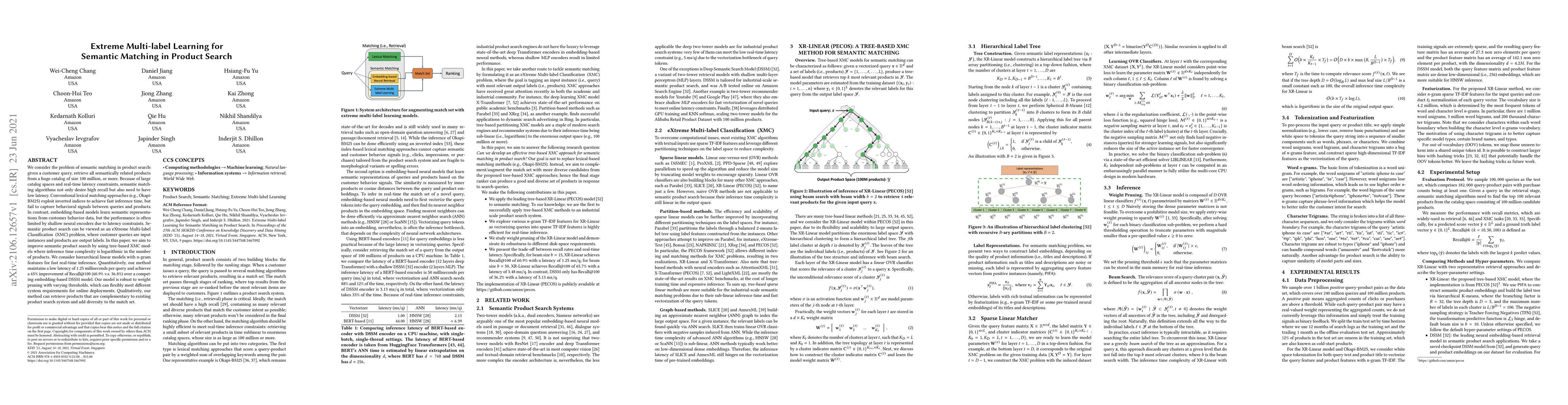 This paper proposes tree-based extreme multi-label classification models for semantic matching in product search, achieving low latency and high recall. The method achieves 1.25 ms per query and a 65% improvement in Recall@100 compared to an embedding-based model, while maintaining flexibility through weight pruning.