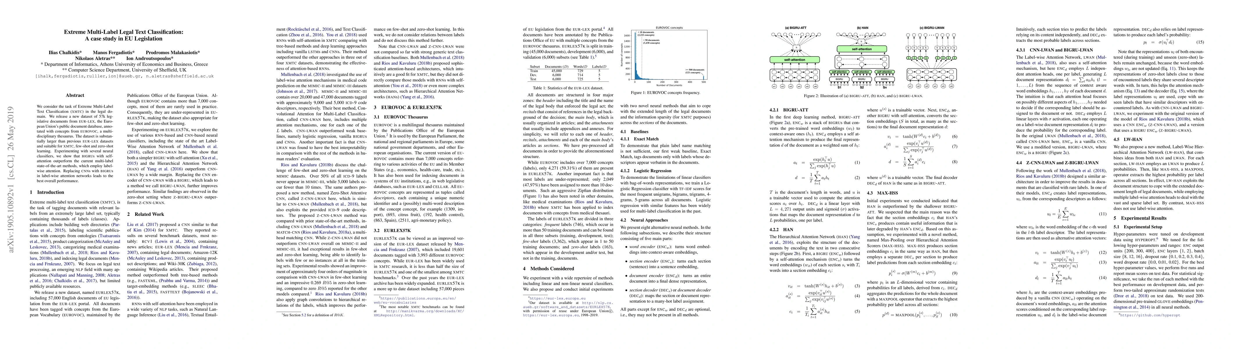 This study presents a new dataset of 57k annotated EU legislative documents for Extreme Multi-Label Text Classification (XMTC). BIGRUs with self-attention were found to outperform existing methods, especially when replacing CNNs in label-wise attention networks.