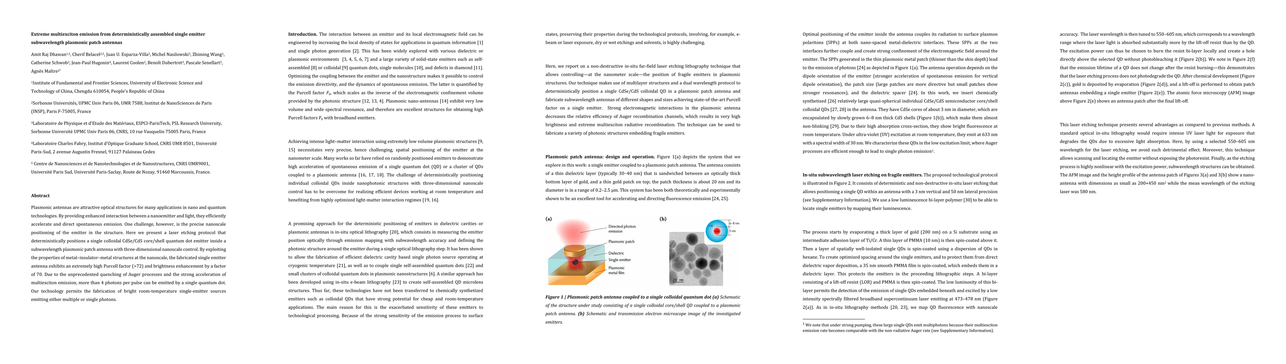 This paper details a laser etching protocol for precisely positioning a single quantum dot emitter in a subwavelength plasmonic patch antenna, achieving extreme multiexciton emission with enhanced brightness and a high Purcell factor of >72, enabling the emission of over 4 photons per pulse. The technology allows for the creation of bright, room-temperature single-emitter sources for quantum technologies.