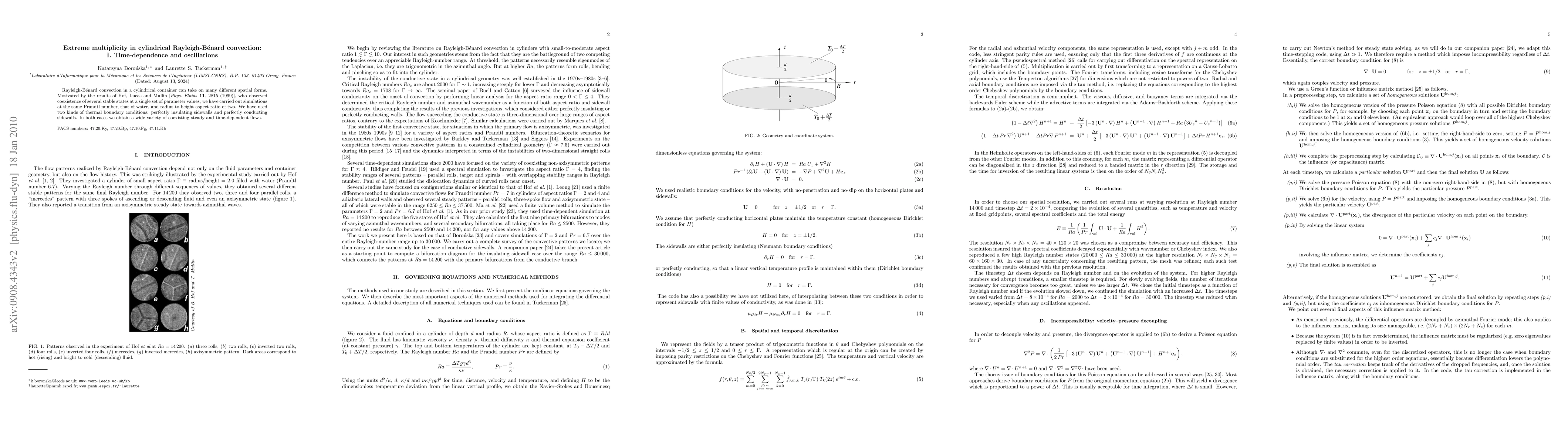 Rayleigh-Benard convection in a cylindrical container can take on many different spatial forms. Motivated by the results of Hof, Lucas and Mullin [Phys. Fluids 11, 2815 (1999)], who observed coexistence of several stable states at a single set of parameter values, we have carried out simulations at the same Prandtl number, that of water, and radius-to-height aspect ratio of two. We have used two kinds of thermal boundary conditions: perfectly insulating sidewalls and perfectly conducting sidewalls. In both cases we obtain a wide variety of coexisting steady and time-dependent flows.