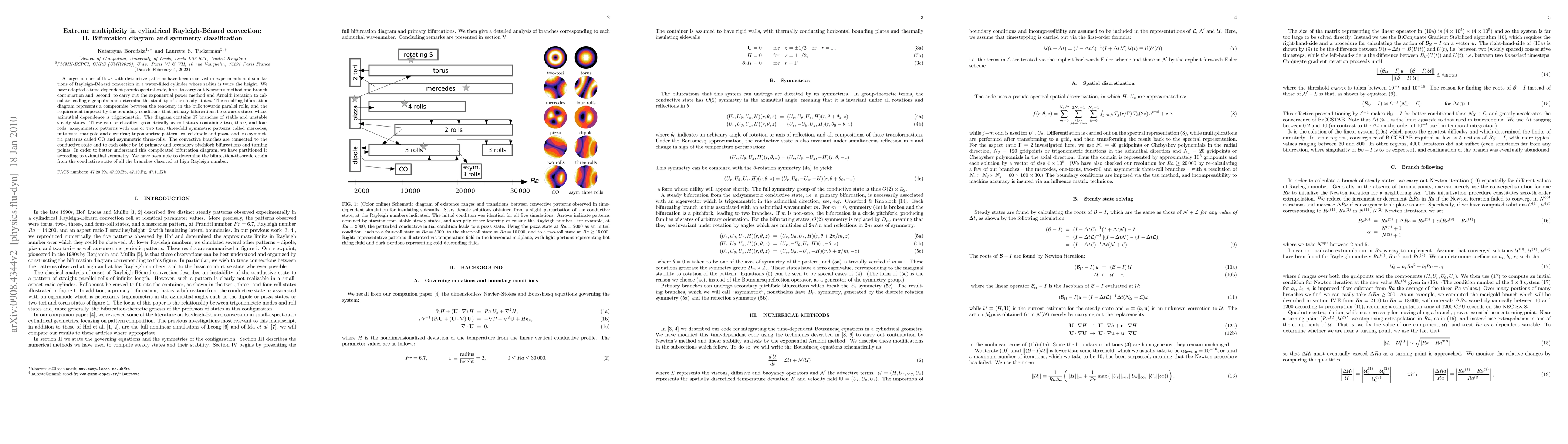 A large number of flows with distinctive patterns have been observed in experiments and simulations of Rayleigh-Benard convection in a water-filled cylinder whose radius is twice the height. We have adapted a time-dependent pseudospectral code, first, to carry out Newton's method and branch continuation and, second, to carry out the exponential power method and Arnoldi iteration to calculate leading eigenpairs and determine the stability of the steady states. The resulting bifurcation diagram represents a compromise between the tendency in the bulk towards parallel rolls, and the requirement imposed by the boundary conditions that primary bifurcations be towards states whose azimuthal dependence is trigonometric. The diagram contains 17 branches of stable and unstable steady states. These can be classified geometrically as roll states containing two, three, and four rolls; axisymmetric patterns with one or two tori; three-fold symmetric patterns called mercedes, mitubishi, marigold and cloverleaf; trigonometric patterns called dipole and pizza; and less symmetric patterns called CO and asymmetric three-rolls. The convective branches are connected to the conductive state and to each other by 16 primary and secondary pitchfork bifurcations and turning points. In order to better understand this complicated bifurcation diagram, we have partitioned it according to azimuthal symmetry. We have been able to determine the bifurcation-theoretic origin from the conductive state of all the branches observed at high Rayleigh number.