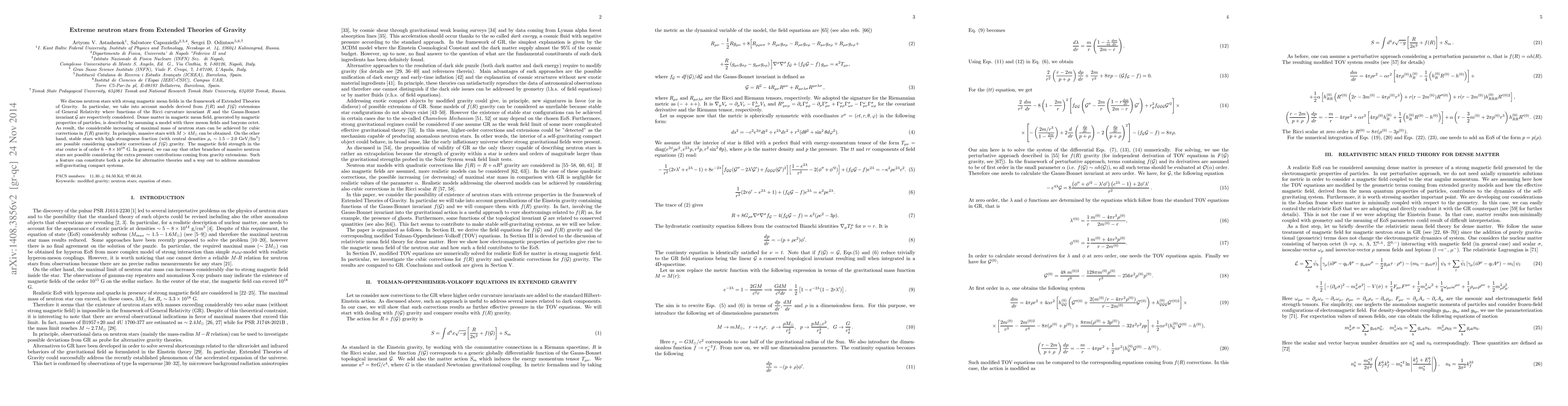 This paper explores neutron stars with strong magnetic fields within Extended Theories of Gravity, specifically $f(R)$ and $f(\mathcal{G})$ models. It finds that cubic corrections in $f(R)$ can increase the maximal mass of neutron stars to over $4 M_{\odot}$, while quadratic corrections in $f(\mathcal{G})$ allow for stable stars with high strangeness fractions and central densities of $1.5-2.0$ GeV/fm$^3$.