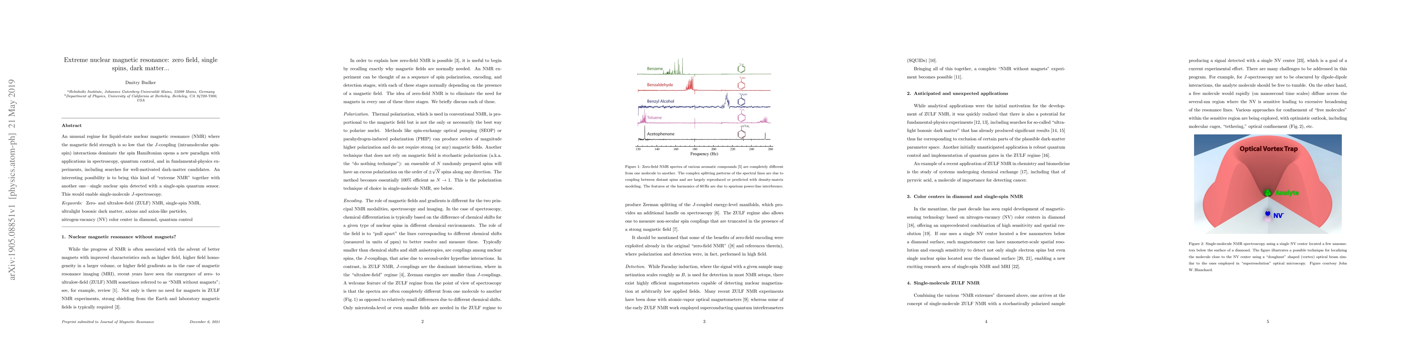 An unusual regime for liquid-state nuclear magnetic resonance (NMR) where the magnetic field strength is so low that the $J$-coupling (intramolecular spin-spin) interactions dominate the spin Hamiltonian opens a new paradigm with applications in spectroscopy, quantum control, and in fundamental-physics experiments, including searches for well-motivated dark-matter candidates. An interesting possibility is to bring this kind of "extreme NMR" together with another one---single nuclear spin detected with a single-spin quantum sensor. This would enable single-molecule $J$-spectroscopy.