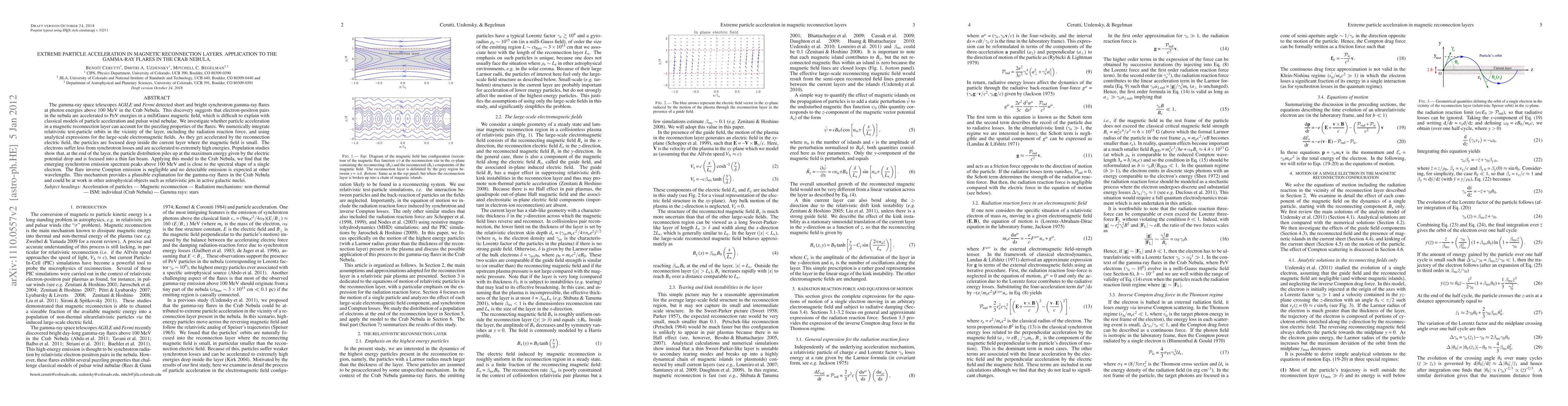 This study proposes that magnetic reconnection layers can accelerate particles to ultra-high energies, explaining the gamma-ray flares in the Crab Nebula. The model predicts synchrotron emission peaking above 100 MeV, consistent with observations, and suggests this mechanism may also apply to other astrophysical objects.
