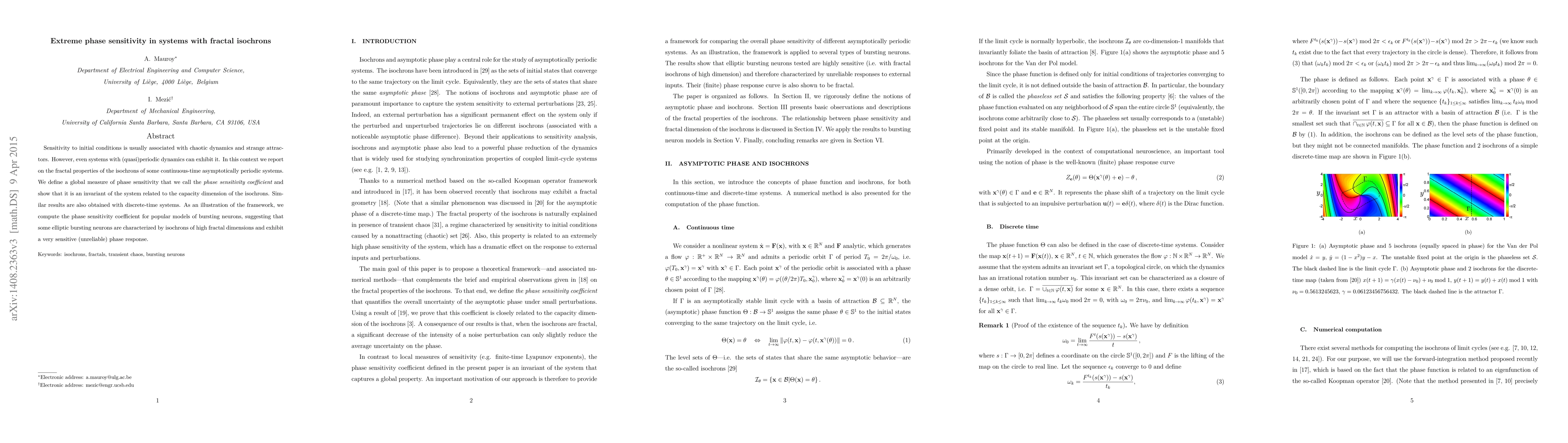 Sensitivity to initial conditions is usually associated with chaotic dynamics and strange attractors. However, even systems with (quasi)periodic dynamics can exhibit it. In this context we report on the fractal properties of the isochrons of some continuous-time asymptotically periodic systems. We define a global measure of phase sensitivity that we call the phase sensitivity coefficient and show that it is an invariant of the system related to the capacity dimension of the isochrons. Similar results are also obtained with discrete-time systems. As an illustration of the framework, we compute the phase sensitivity coefficient for popular models of bursting neurons, suggesting that some elliptic bursting neurons are characterized by isochrons of high fractal dimensions and exhibit a very sensitive (unreliable) phase response.