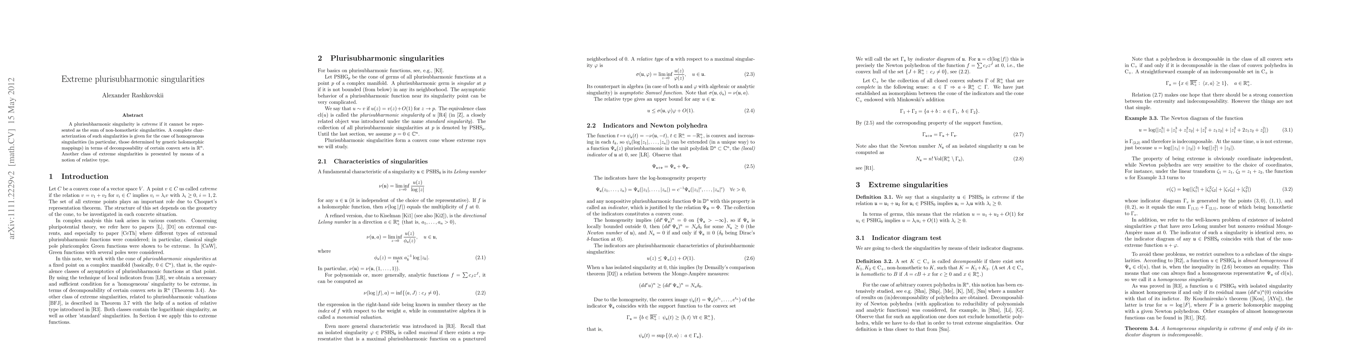 A plurisubharmonic singularity is extreme if it cannot be represented as the sum of non-homothetic singularities. A complete characterization of such singularities is given for the case of homogeneous singularities (in particular, those determined by generic holomorphic mappings) in terms of decomposability of certain convex sets in $\Rn$. Another class of extreme singularities is presented by means of a notion of relative type.