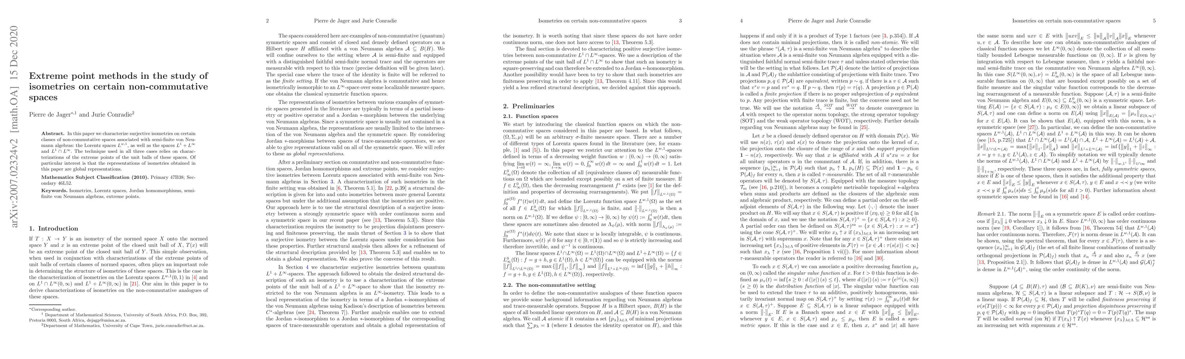 This paper characterizes surjective isometries on Lorentz spaces and related non-commutative spaces by utilizing extreme point methods, focusing on the unit balls' extreme points to derive global representations of the isometries.