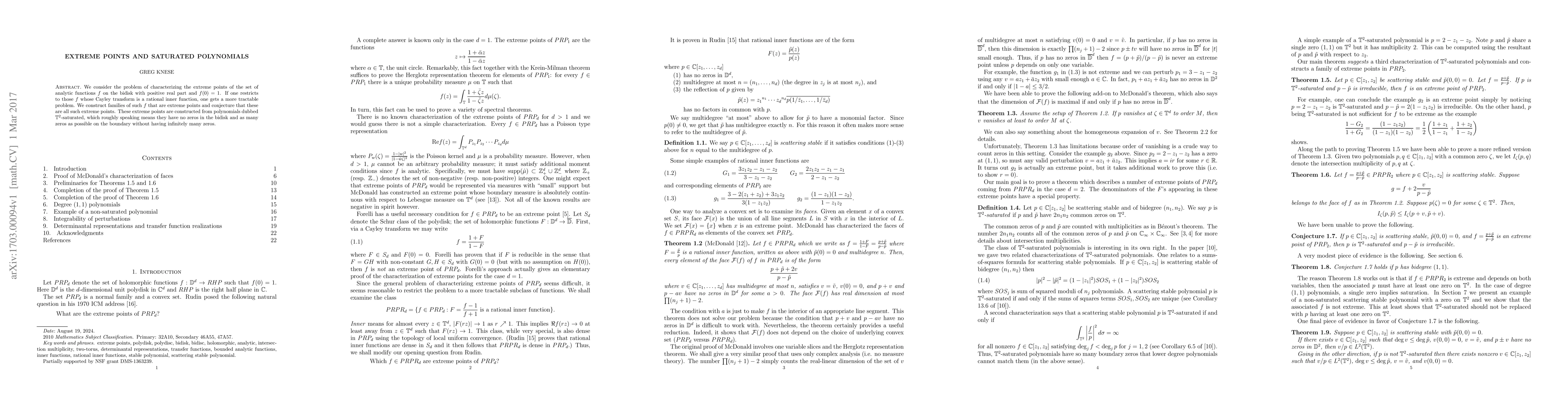 This paper characterizes extreme points of analytic functions on the bidisk with positive real part and f(0)=1, focusing on rational inner functions. The authors construct families of such functions, termed saturated polynomials, which are conjectured to represent all extreme points.