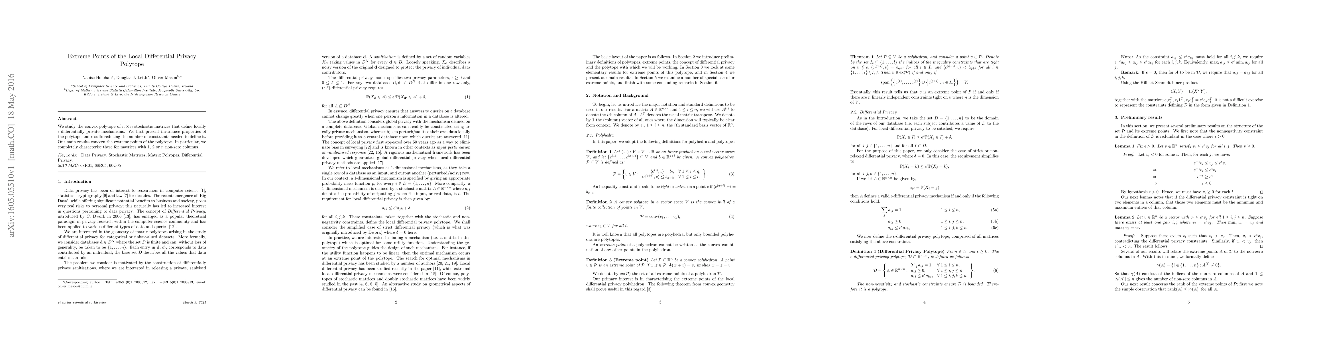 Researchers studied the extreme points of locally differentially private mechanisms, finding that matrices with 1, 2, or n non-zero columns have fully characterized extreme points.