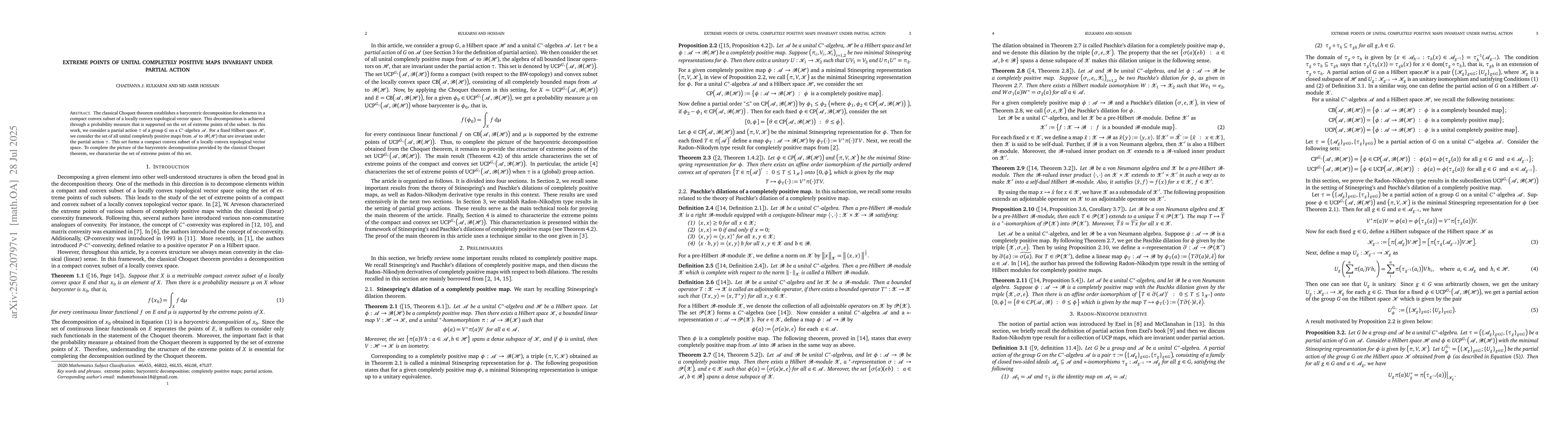 The classical Choquet theorem establishes a barycentric decomposition for elements in a compact convex subset of a locally convex topological vector space. This decomposition is achieved through a probability measure that is supported on the set of extreme points of the subset. In this work, we consider a partial action $\tau$ of a group $G$ on a $C^\ast$-algebra $\mathcal{A}$. For a fixed Hilbert space $\mathcal{H}$, we consider the set of all unital completely positive maps from $\mathcal{A}$ to $\mathcal{B}(\mathcal{H})$ that are invariant under the partial action $\tau$. This set forms a compact convex subset of a locally convex topological vector space. To complete the picture of the barycentric decomposition provided by the classical Choquet theorem, we characterize the set of extreme points of this set.