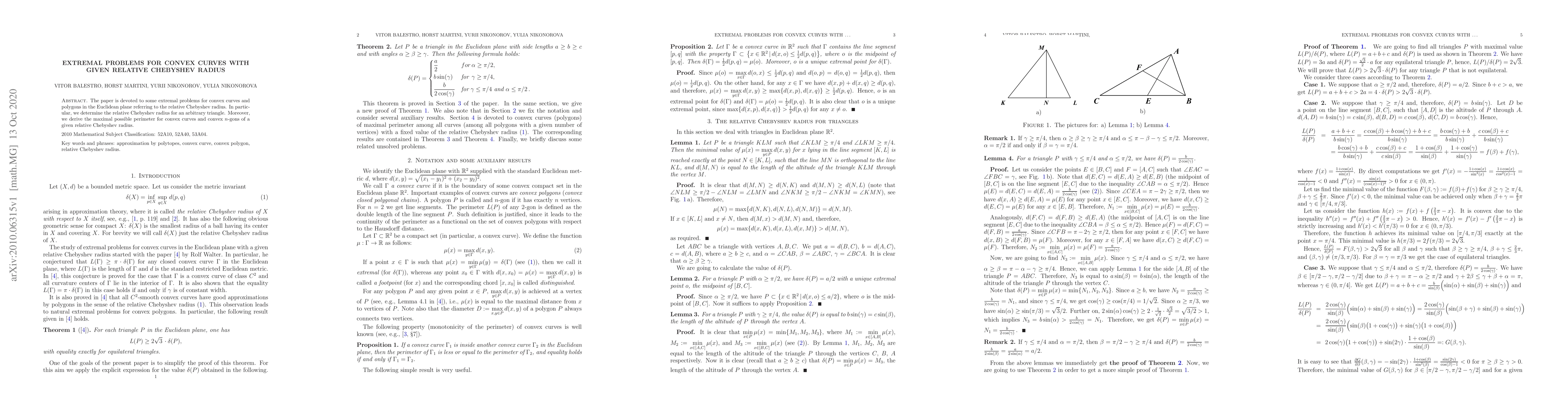 The paper investigates extremal problems for convex curves and polygons in the Euclidean plane, focusing on determining the relative Chebyshev radius for triangles and finding the maximal possible perimeter for convex shapes of a given radius.