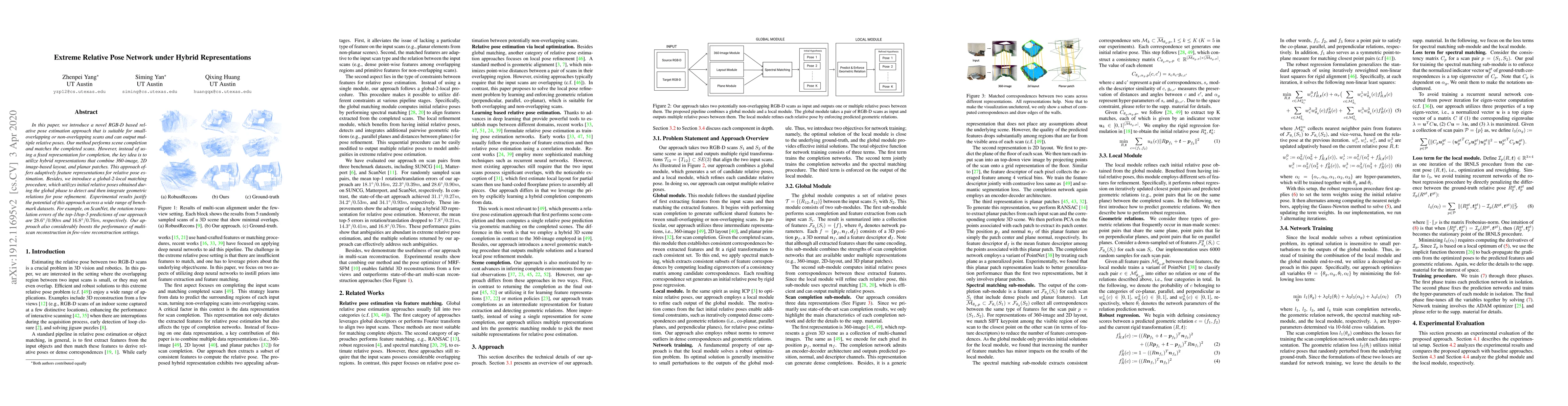 In this paper, we introduce a novel RGB-D based relative pose estimation approach that is suitable for small-overlapping or non-overlapping scans and can output multiple relative poses. Our method performs scene completion and matches the completed scans. However, instead of using a fixed representation for completion, the key idea is to utilize hybrid representations that combine 360-image, 2D image-based layout, and planar patches. This approach offers adaptively feature representations for relative pose estimation. Besides, we introduce a global-2-local matching procedure, which utilizes initial relative poses obtained during the global phase to detect and then integrate geometric relations for pose refinement. Experimental results justify the potential of this approach across a wide range of benchmark datasets. For example, on ScanNet, the rotation translation errors of the top-1/top-5 predictions of our approach are 28.6/0.90m and 16.8/0.76m, respectively. Our approach also considerably boosts the performance of multi-scan reconstruction in few-view reconstruction settings.