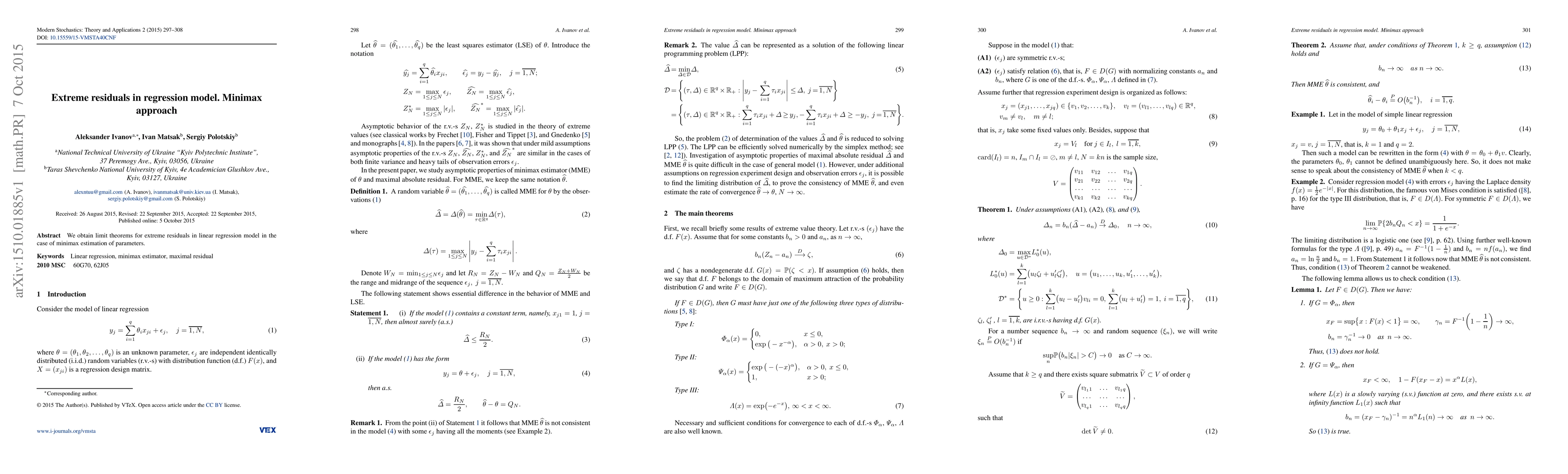 This paper establishes limit theorems for extreme residuals in linear regression models using minimax estimation of parameters, providing insights into reliable prediction.