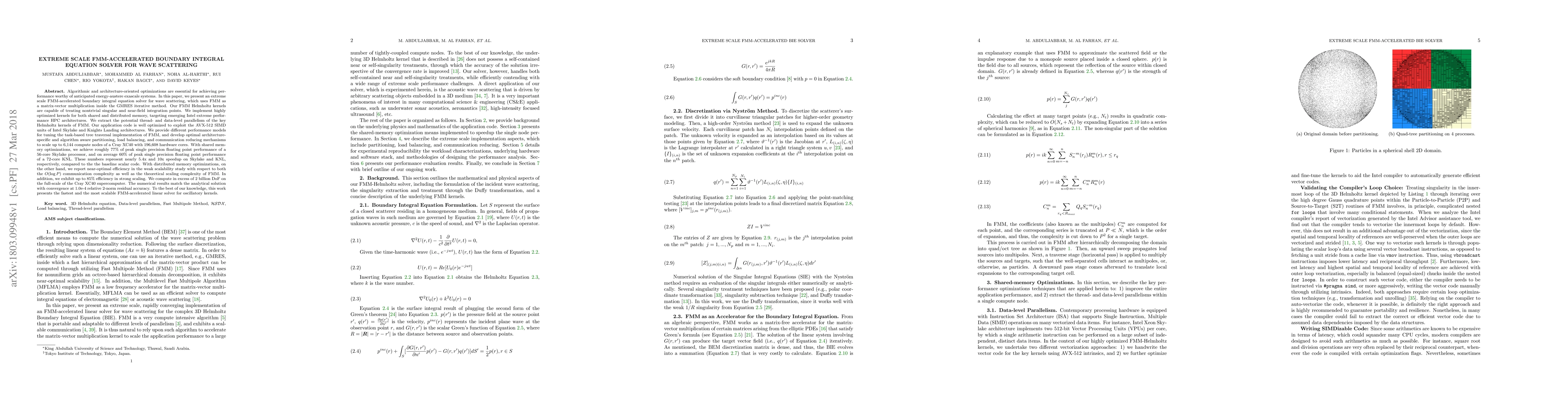 This paper presents an optimized FMM-accelerated boundary integral equation solver for wave scattering, achieving significant performance on exascale systems. The solver leverages FMM for matrix-vector multiplication within the GMRES method, optimized for both shared and distributed memory architectures, and exploits AVX-512 SIMD units. The implementation scales to 6,144 compute nodes on a Cray XC40, achieving nearly 5.4x and 10x speedup on Intel Skylake and Knights Landing, respectively, compared to a scalar baseline.