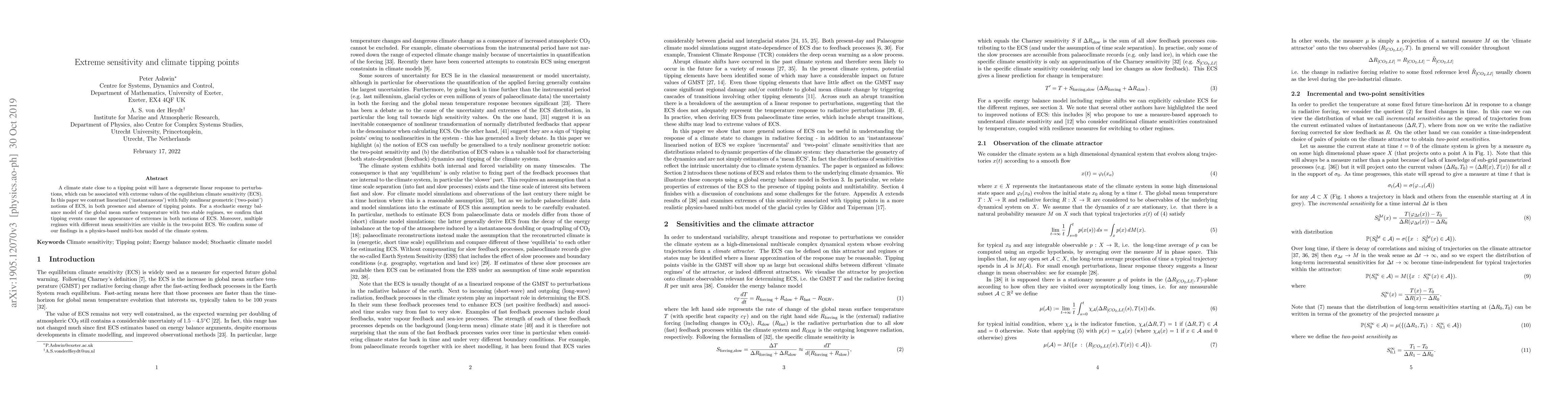 A climate state close to a tipping point will have a degenerate linear response to perturbations, which can be associated with extreme values of the equilibrium climate sensitivity (ECS). In this paper we contrast linearized (`instantaneous') with fully nonlinear geometric (`two-point') notions of ECS, in both presence and absence of tipping points. For a stochastic energy balance model of the global mean surface temperature with two stable regimes, we confirm that tipping events cause the appearance of extremes in both notions of ECS. Moreover, multiple regimes with different mean sensitivities are visible in the two-point ECS. We confirm some of our findings in a physics-based multi-box model of the climate system.