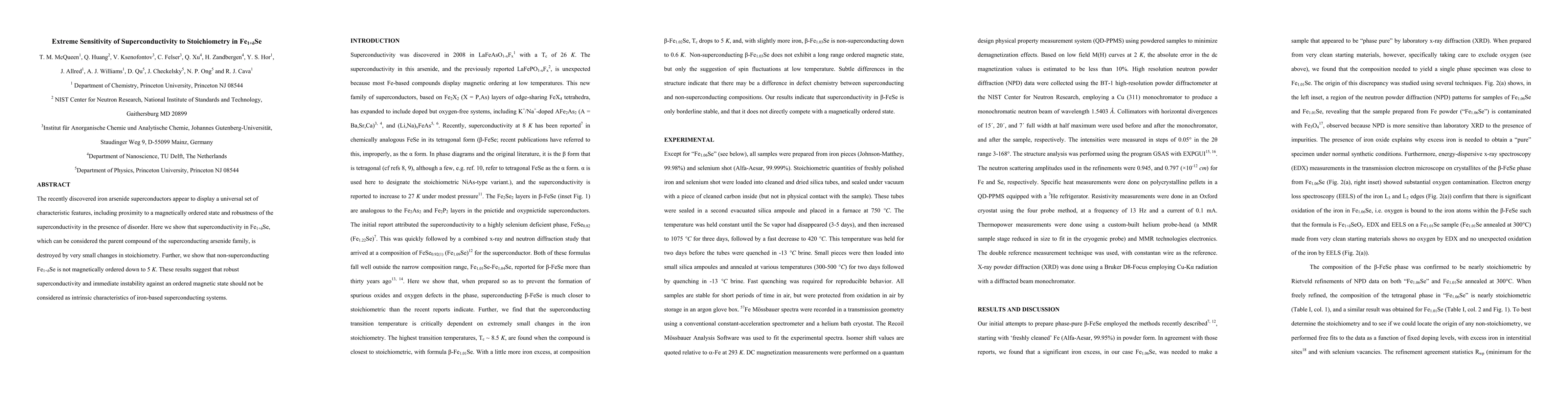 The recently discovered iron arsenide superconductors, which display superconducting transition temperatures as high as 55 K, appear to share a number of general features with high-Tc cuprates, including proximity to a magnetically ordered state and robustness of the superconductivity in the presence of disorder. Here we show that superconductivity in Fe1+dSe, the parent compound of the superconducting arsenide family, is destroyed by very small changes in stoichiometry. Further, we show that non-superconducting Fe1+dSe is not magnetically ordered down to low temperatures. These results suggest that robust superconductivity and immediate instability against an ordered magnetic state should not be considered as intrinsic characteristics of iron-based superconducting systems, and that Fe1+dSe may present a unique opportunity for determining which materials characteristics are critical to the existence of superconductivity in high Tc iron arsenide superconductors and which are not.