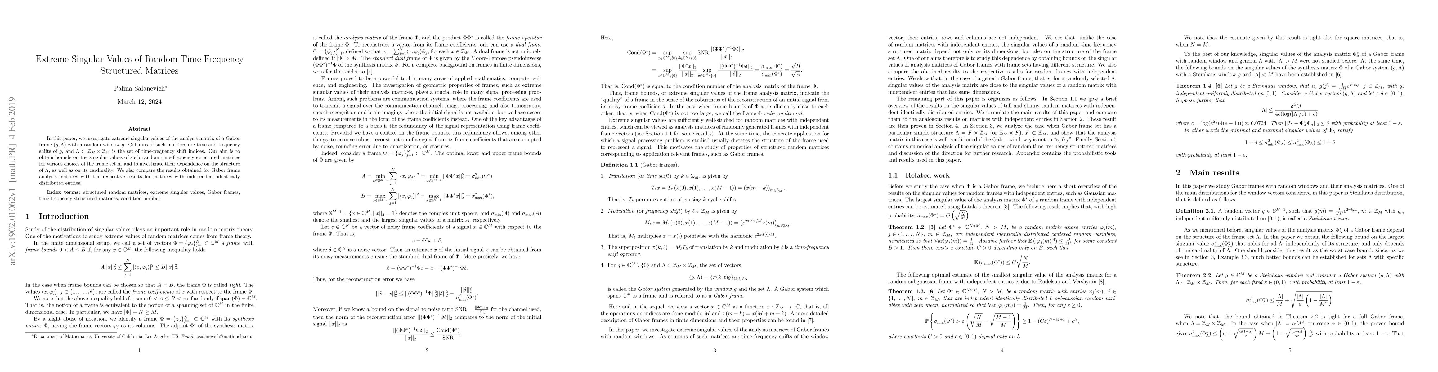 This paper investigates the extreme singular values of random time-frequency structured matrices, specifically Gabor frame analysis matrices, to establish bounds on their singular values and analyze how these values depend on the structure and cardinality of the shift index set, comparing with matrices of independent entries.