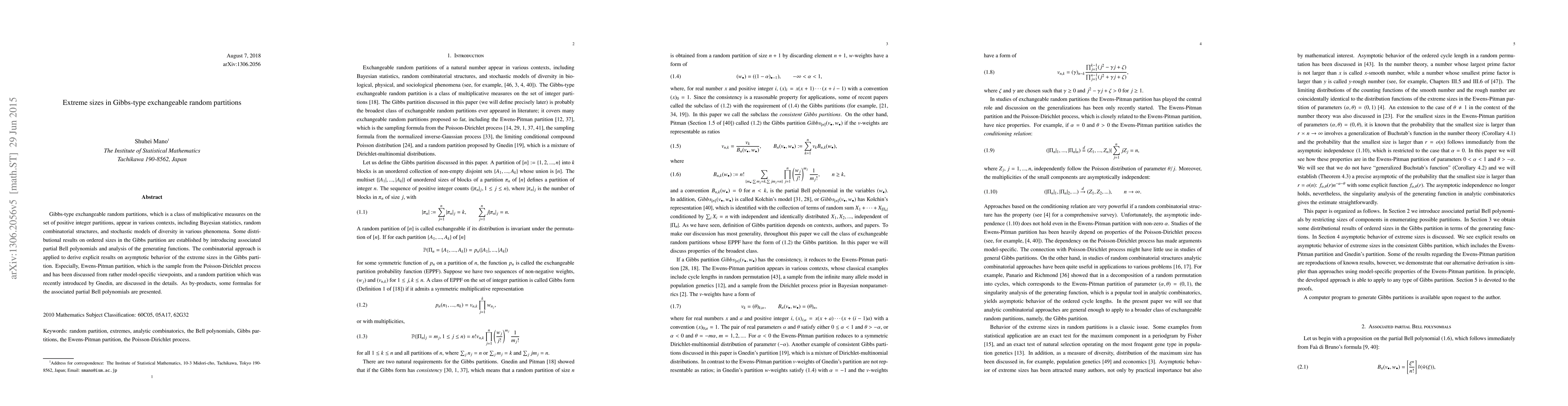 This paper investigates the asymptotic behavior of extreme sizes in Gibbs-type exchangeable random partitions, focusing on the Ewens-Pitman partition and a recent partition model by Gnedin. It employs combinatorial methods and generating functions to derive explicit results and presents new formulas for associated partial Bell polynomials.