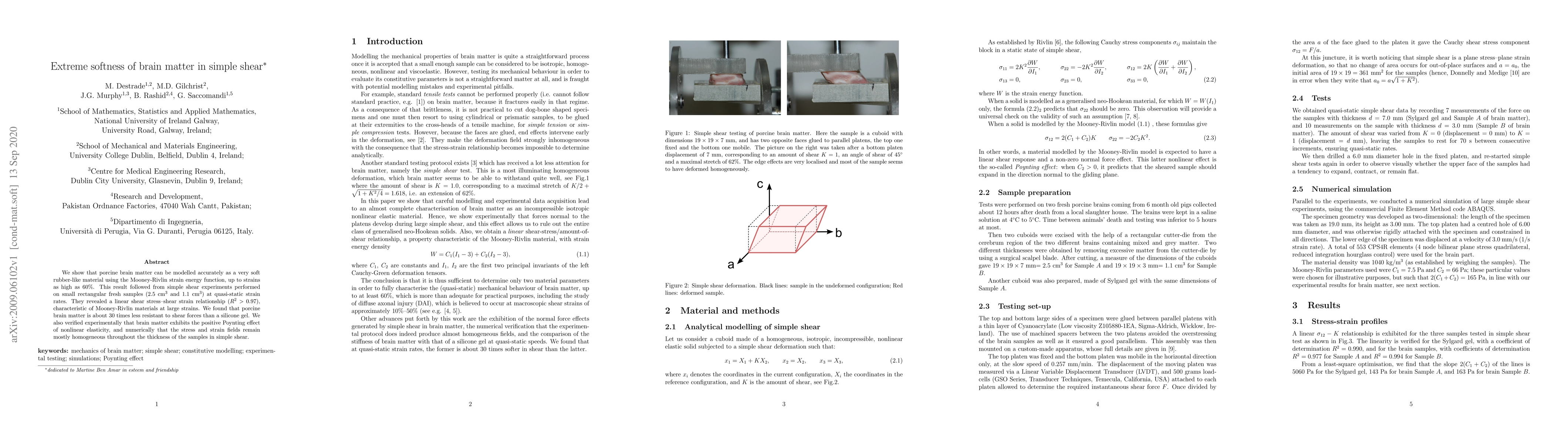 We show that porcine brain matter can be modelled accurately as a very soft rubber-like material using the Mooney-Rivlin strain energy function, up to strains as high as 60\%. This result followed from simple shear experiments performed on small rectangular fresh samples ($2.5$ cm$^3$ and $1.1$ cm$^3$) at quasi-static strain rates. They revealed a linear shear stress--shear strain relationship ($R^2> 0.97 $), characteristic of Mooney-Rivlin materials at large strains. We found that porcine brain matter is about 30 times less resistant to shear forces than a silicone gel. We also verified experimentally that brain matter exhibits the positive Poynting effect of nonlinear elasticity, and numerically that the stress and strain fields remain mostly homogeneous throughout the thickness of the samples in simple shear.