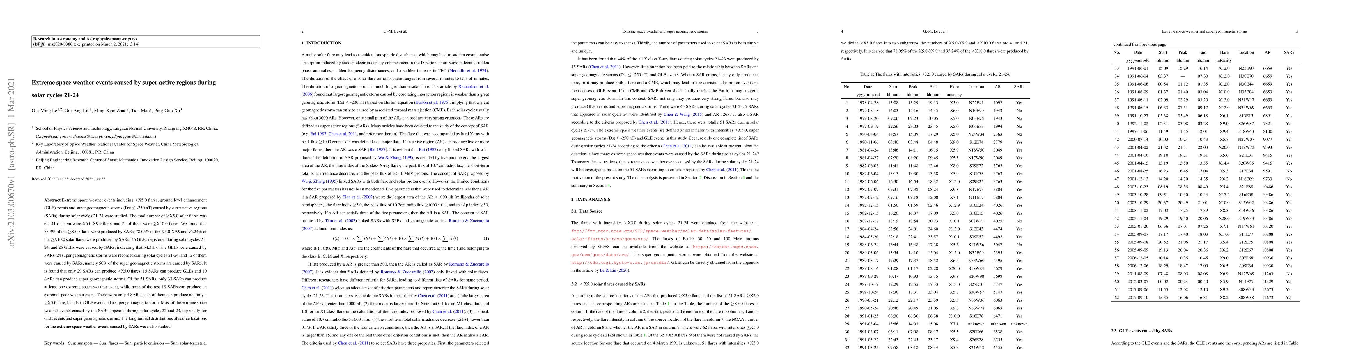 This study investigates extreme space weather events, including X5.0 flares, ground level enhancements (GLEs), and super geomagnetic storms, caused by super active regions (SARs) during solar cycles 21-24. It finds that SARs are responsible for the majority of these events, with 83.9% of X5.0 flares, 54.3% of GLEs, and 50% of super geomagnetic storms linked to SARs.