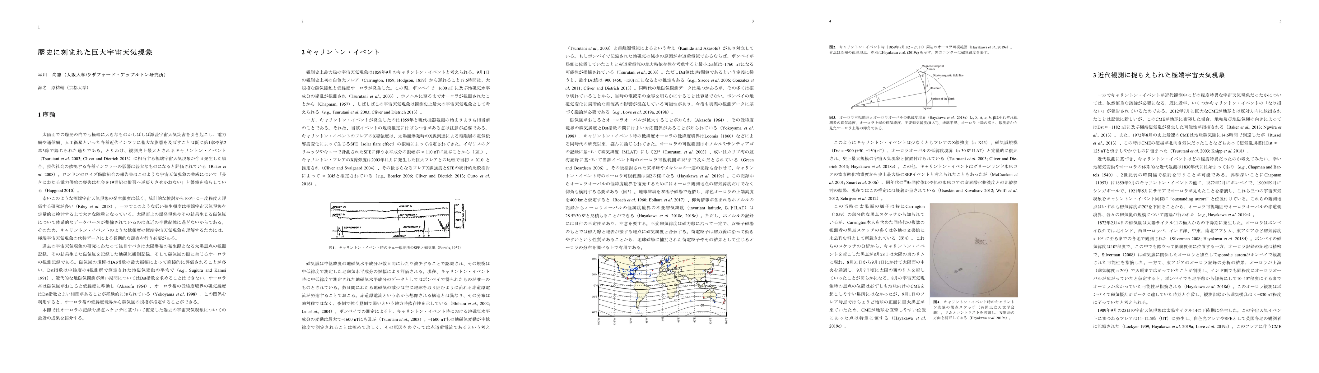 This section shows an overview of a recent development of the studies on great space weather events in history. Its discussion starts from the Carrington event and compare its intensity with the extreme storms within the coverage of the regular magnetic measurements. Extending its analyses back beyond their onset, this section shows several case studies of extreme storms with sunspot records in the telescopic observations and candidate auroral records in historical records. Before the onset of telescopic observations, this section shows the chronological coverages of the records of unaided-eye sunspot and candidate aurorae and several case studies on their basis.