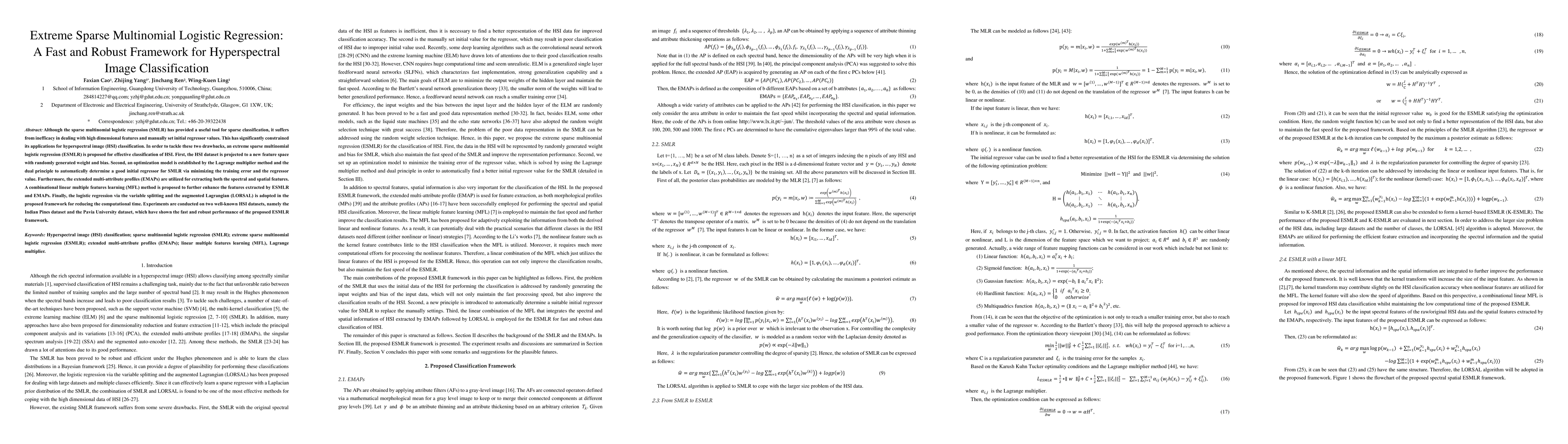 The paper proposes extreme sparse multinomial logistic regression (ESMLR) to enhance hyperspectral image classification by addressing high-dimensional feature challenges and initial regressor inefficiencies. The framework employs feature space projection, optimization modeling, and advanced feature learning techniques to achieve fast and robust classification results on two HSI datasets.