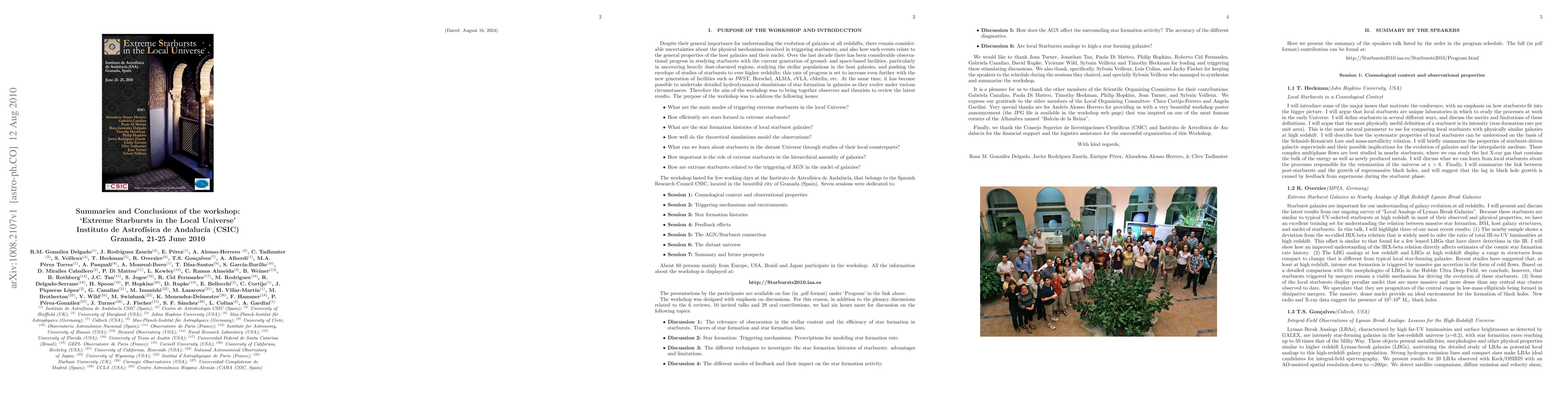 The "Extreme starbursts in the local universe" workshop was held at the Insituto de Astrofisica de Andalucia in Granada, Spain on 21-25 June 2010. Bearing in mind the advent of a new generation of facilities such as JWST, Herschel, ALMA, eVLA and eMerlin, the aim of the workshop was to bring together observers and theorists to review the latest results. The purpose of the workshop was to address the following issues: what are the main modes of triggering extreme starbursts in the local Universe? How efficiently are stars formed in extreme starbursts? What are the star formation histories of local starburst galaxies? How well do the theoretical simulations model the observations? What can we learn about starbursts in the distant Universe through studies of their local counterparts? How important is the role of extreme starbursts in the hierarchical assembly of galaxies? How are extreme starbursts related to the triggering of AGN in the nuclei of galaxies? Overall, 41 talks and 4 posters with their corresponding 10 minutes short talks were presented during the workshop. In addition, the workshop was designed with emphasis on discussions, and therefore, there were 6 discussion sessions of up to one hour during the workshop. Here is presented a summary of the purposes of the workshop as well as a compilation of the abstracts corresponding to each of the presentations. The summary and conclusions of the workshop along with a description of the future prospects by Sylvain Veilleux can be found in the last section of this document. A photo of the assistants is included.