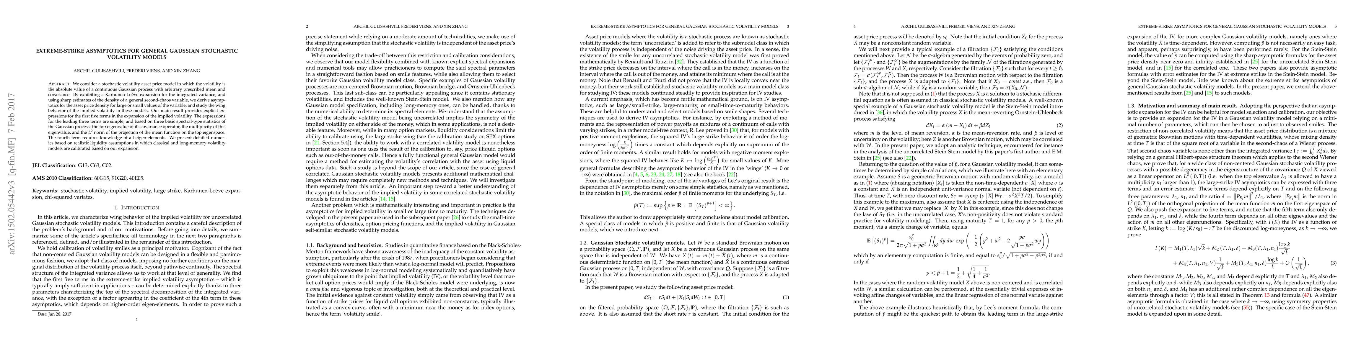 We consider a stochastic volatility asset price model in which the volatility is the absolute value of a continuous Gaussian process with arbitrary prescribed mean and covariance. By exhibiting a Karhunen-Lo\`{e}ve expansion for the integrated variance, and using sharp estimates of the density of a general second-chaos variable, we derive asymptotics for the asset price density for large or small values of the variable, and study the wing behavior of the implied volatility in these models. Our main result provides explicit expressions for the first five terms in the expansion of the implied volatility. The expressions for the leading three terms are simple, and based on three basic spectral-type statistics of the Gaussian process: the top eigenvalue of its covariance operator, the multiplicity of this eigenvalue, and the $L^{2}$ norm of the projection of the mean function on the top eigenspace. The fourth term requires knowledge of all eigen-elements. We present detailed numerics based on realistic liquidity assumptions in which classical and long-memory volatility models are calibrated based on our expansion.