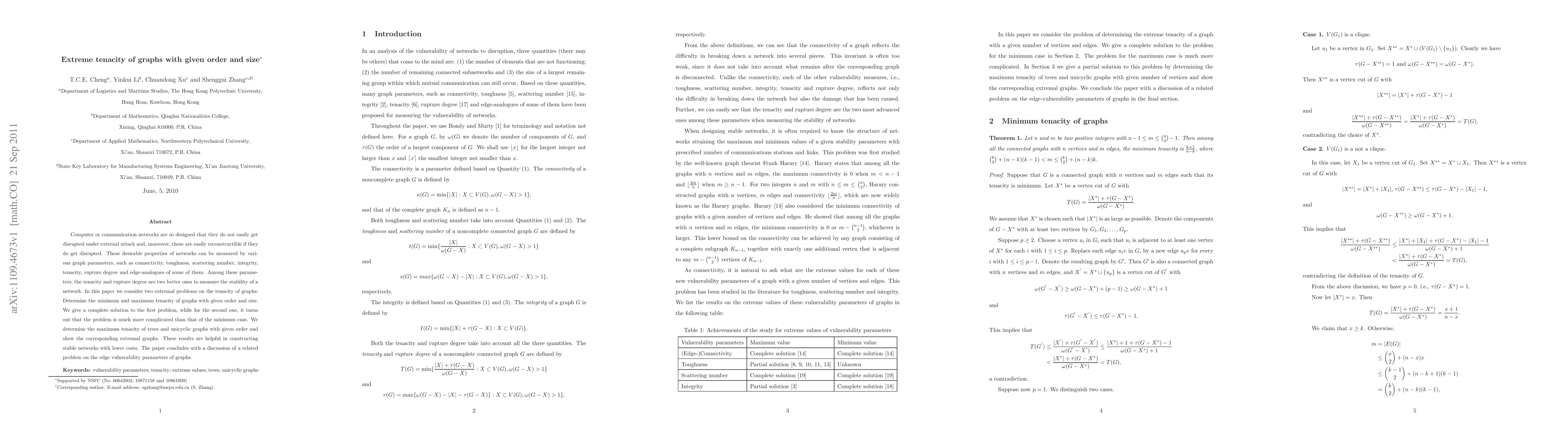 Computer or communication networks are so designed that they do not easily get disrupted under external attack and, moreover, these are easily reconstructible if they do get disrupted. These desirable properties of networks can be measured by various graph parameters, such as connectivity, toughness, scattering number, integrity, tenacity, rupture degree and edge-analogues of some of them. Among these parameters, the tenacity and rupture degree are two better ones to measure the stability of a network. In this paper we consider two extremal problems on the tenacity of graphs: Determine the minimum and maximum tenacity of graphs with given order and size. We give a complete solution to the first problem, while for the second one, it turns out that the problem is much more complicated than that of the minimum case. We determine the maximum tenacity of trees and unicyclic graphs with given order and show the corresponding extremal graphs. These results are helpful in constructing stable networks with lower costs. The paper concludes with a discussion of a related problem on the edge vulnerability parameters of graphs.