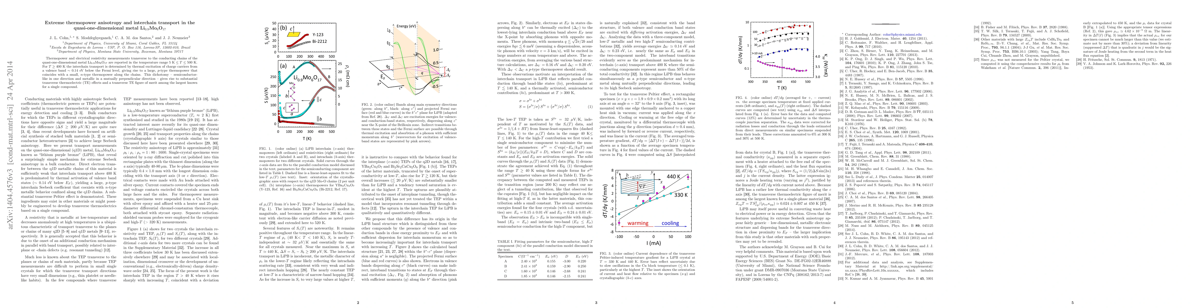 Thermopower and electrical resistivity measurements transverse to the conducting chains of the quasi-one-dimensional metal Li(0.9)Mo(6)O(17) are reported in the temperature range 5 K <= T <= 500 K. For T>= 400 K the interchain transport is determined by thermal excitation of charge carriers from a valence band ~ 0.14 eV below the Fermi level, giving rise to a large, p-type thermopower that coincides with a small, n-type thermopower along the chains. This dichotomy -- semiconductor-like in one direction and metallic in a mutually perpendicular direction -- gives rise to substantial transverse thermoelectric (TE) effects and a transverse TE figure of merit among the largest known for a single compound.