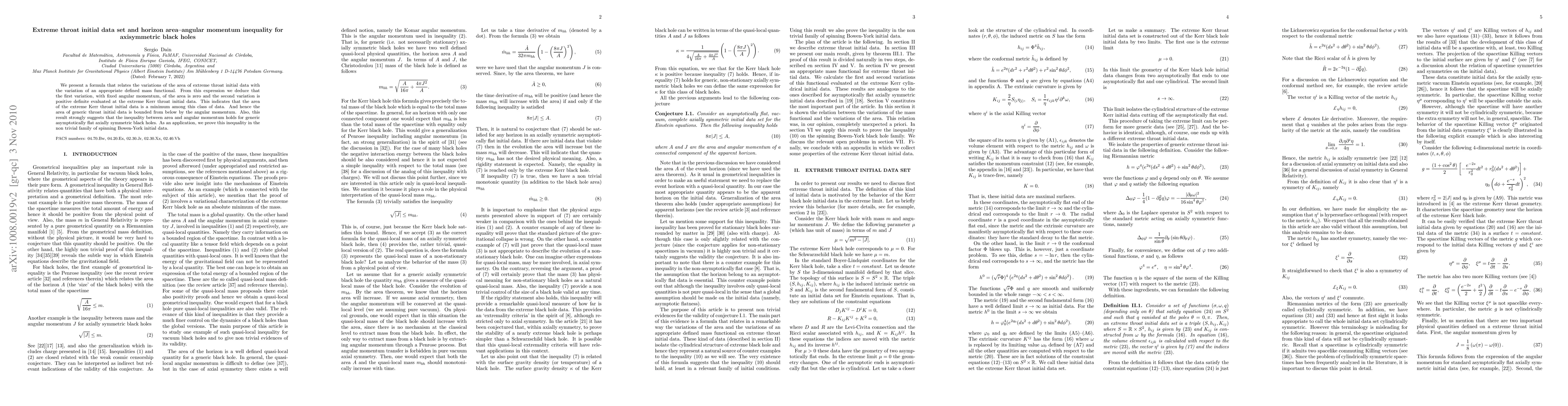 This paper establishes a formula linking the area of extreme throat initial data to a mass functional and shows that the area is minimized for extreme Kerr throat initial data. It also proves an inequality between the area and angular momentum for generic asymptotically flat, axisymmetric black holes, specifically in the context of spinning Bowen-York initial data.