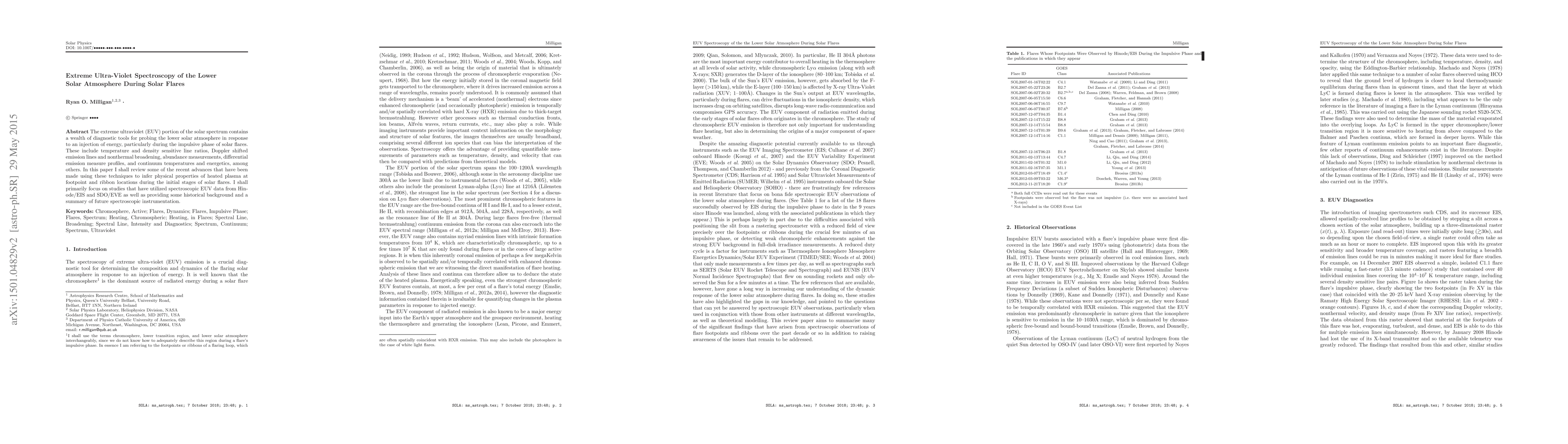 This paper reviews recent advances in extreme ultraviolet spectroscopy of the lower solar atmosphere during solar flares, emphasizing techniques like line ratios and Doppler shifts, and highlights contributions from Hinode/EIS and SDO/EVE, along with a brief historical context and future instrument prospects.