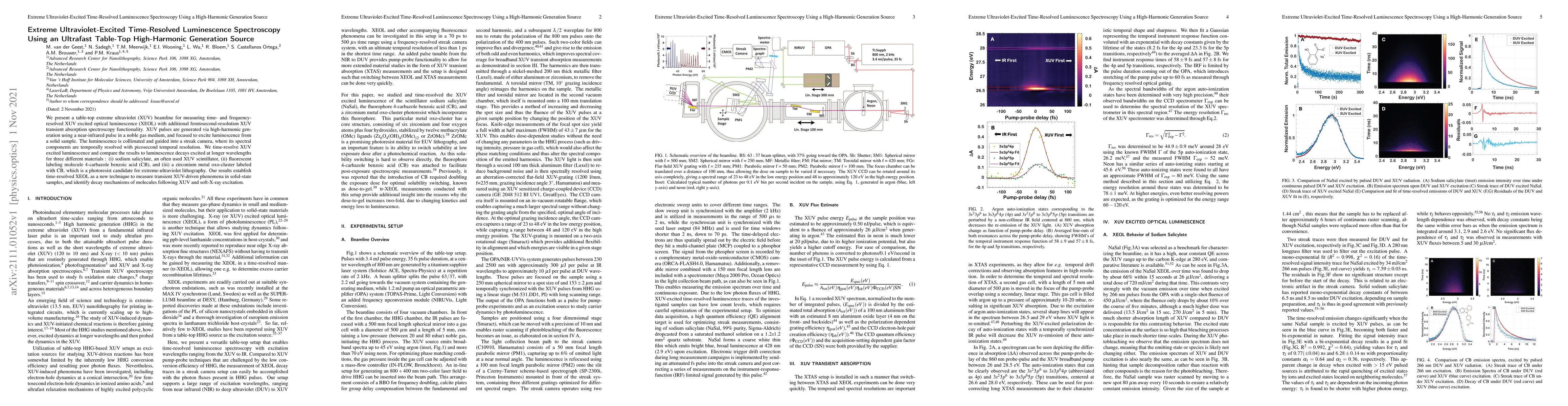 We present a table-top extreme ultraviolet (XUV) beamline for measuring time- and frequency-resolved XUV excited optical luminescence (XEOL) with additional femtosecond-resolution XUV transient absorption spectroscopy functionality. XUV pulses are generated via high-harmonic generation using a near-infrared pulse in a noble gas medium, and focused to excite luminescence from a solid sample. The luminescence is collimated and guided into a streak camera, where its spectral components are temporally resolved with picosecond temporal resolution. We time-resolve XUV excited luminescence and compare the results to luminescence decays excited at longer wavelengths for three different materials : (i) sodium salicylate, an often used XUV scintillator, (ii) fluorescent labeling molecule 4-carbazole benzoic acid (CB), and (iii) a zirconium metal oxo-cluster labeled with CB, which is a photoresist candidate for extreme-ultraviolet lithography. Our results establish time-resolved XEOL as a new technique to measure transient XUV-driven phenomena in solid-state samples, and identify decay mechanisms of molecules following XUV and soft-X-ray excitation.