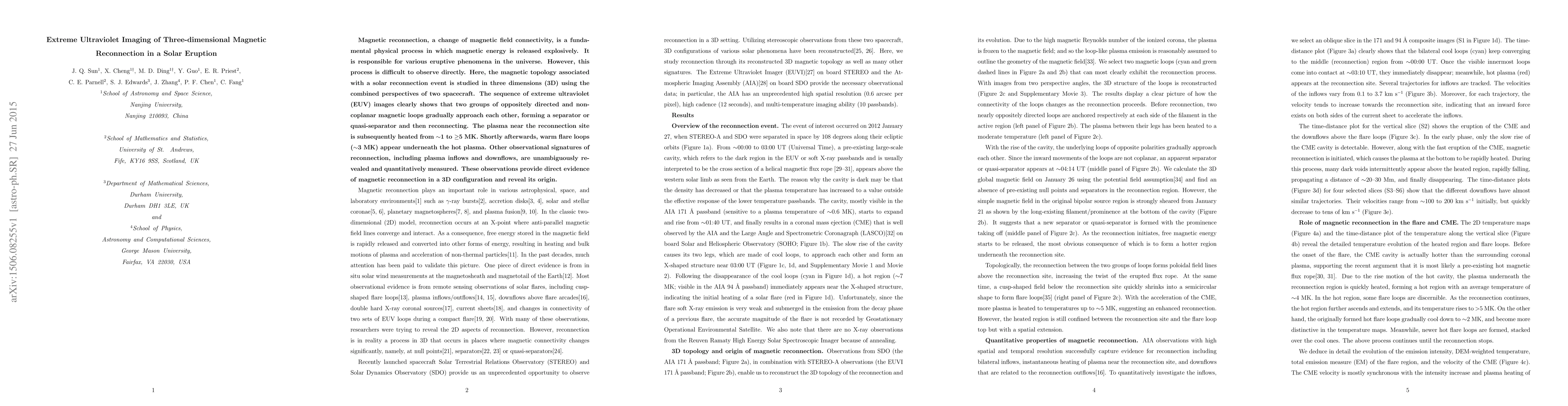 This study uses extreme ultraviolet imaging from two spacecraft to observe three-dimensional magnetic reconnection during a solar eruption, revealing the approach and reconnection of oppositely directed magnetic loops and subsequent plasma heating. The findings provide direct evidence of the process and its three-dimensional configuration.