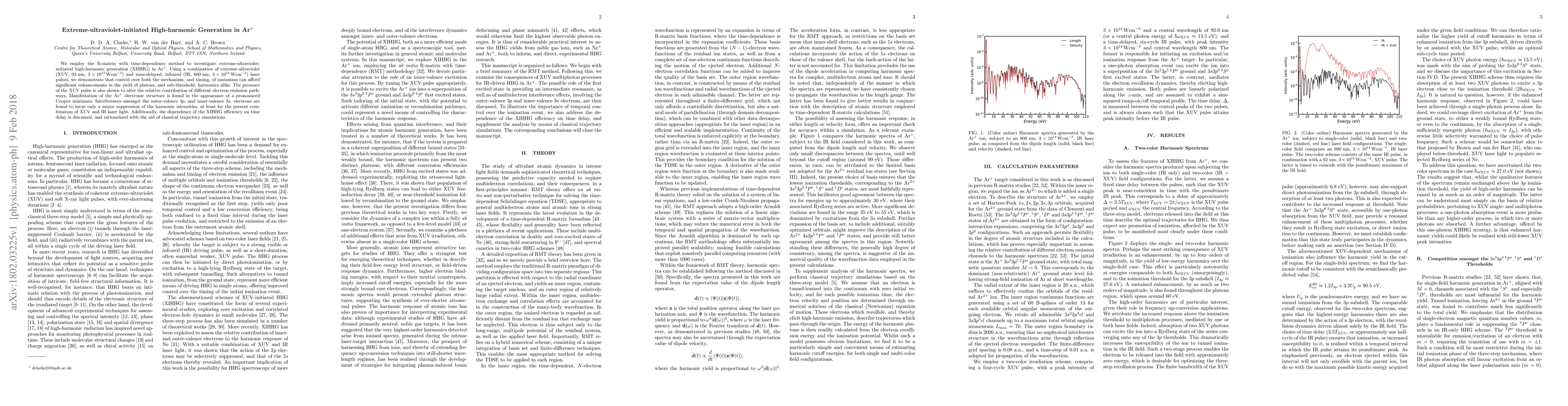 The research employs the R-matrix with time-dependence method to investigate extreme-ultraviolet-initiated high-harmonic generation (XIHHG) in Ar+ using a combination of extreme-ultraviolet (XUV, 92 nm, 3×10^12 Wcm^-2) and time-delayed, infrared (IR, 800 nm, 3×10^14 Wcm^-2) laser pulses.