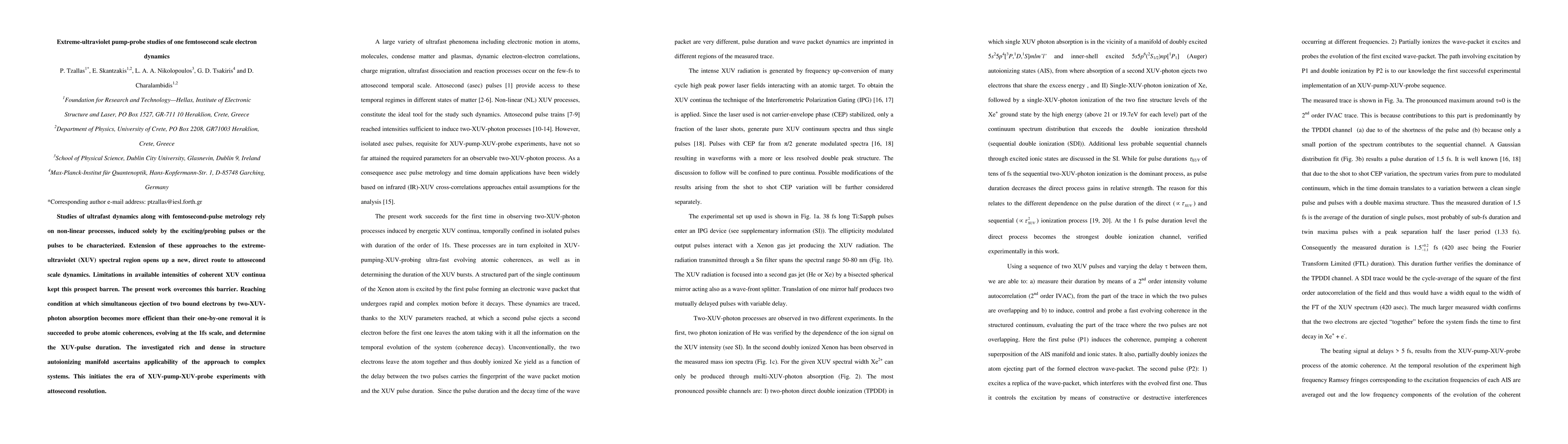 Studies of ultrafast dynamics along with femtosecond-pulse metrology rely on non-linear processes, induced solely by the exciting/probing pulses or the pulses to be characterized. Extension of these approaches to the extreme-ultraviolet (XUV) spectral region opens up a new, direct route to attosecond scale dynamics. Limitations in available intensities of coherent XUV continua kept this prospect barren. The present work overcomes this barrier. Reaching condition at which simultaneous ejection of two bound electrons by two-XUV-photon absorption becomes more efficient than their one-by-one removal it is succeeded to probe atomic coherences, evolving at the 1fs scale, and determine the XUV-pulse duration. The investigated rich and dense in structure autoionizing manifold ascertains applicability of the approach to complex systems. This initiates the era of XUV-pump-XUV-probe experiments with attosecond resolution.