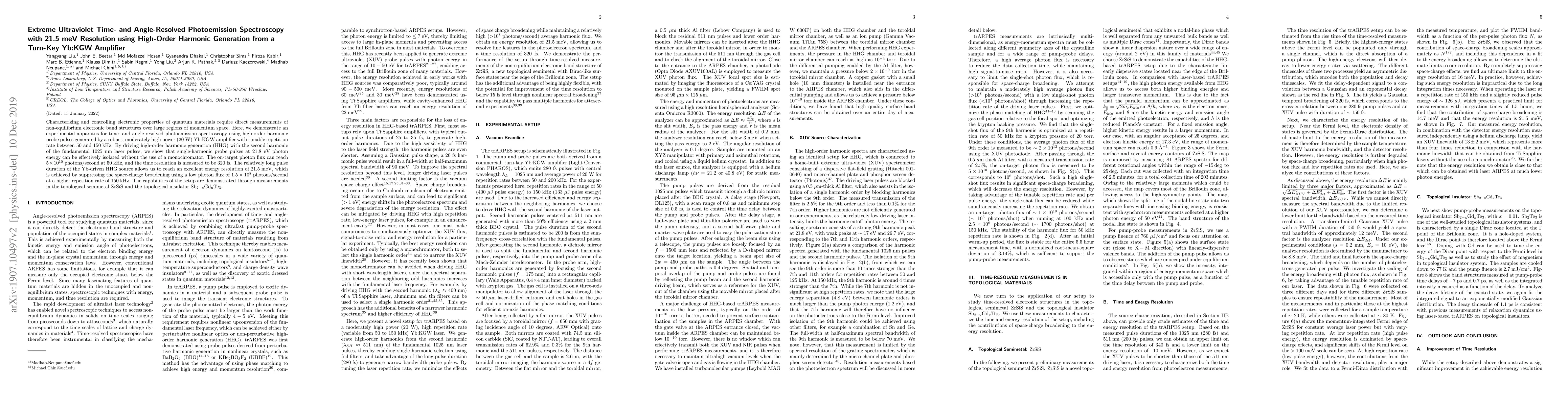 This paper presents an experimental setup using high-order harmonic generation from a Yb:KGW amplifier for time- and angle-resolved photoemission spectroscopy, achieving a 21.5 meV energy resolution and demonstrating its application on topological materials like ZrSiS and Sb2-xGdxTe3. The system isolates single-harmonic probe pulses at 21.8 eV without a monochromator, providing a photon flux of 5 x 10^10 photons/second at 50 kHz.
