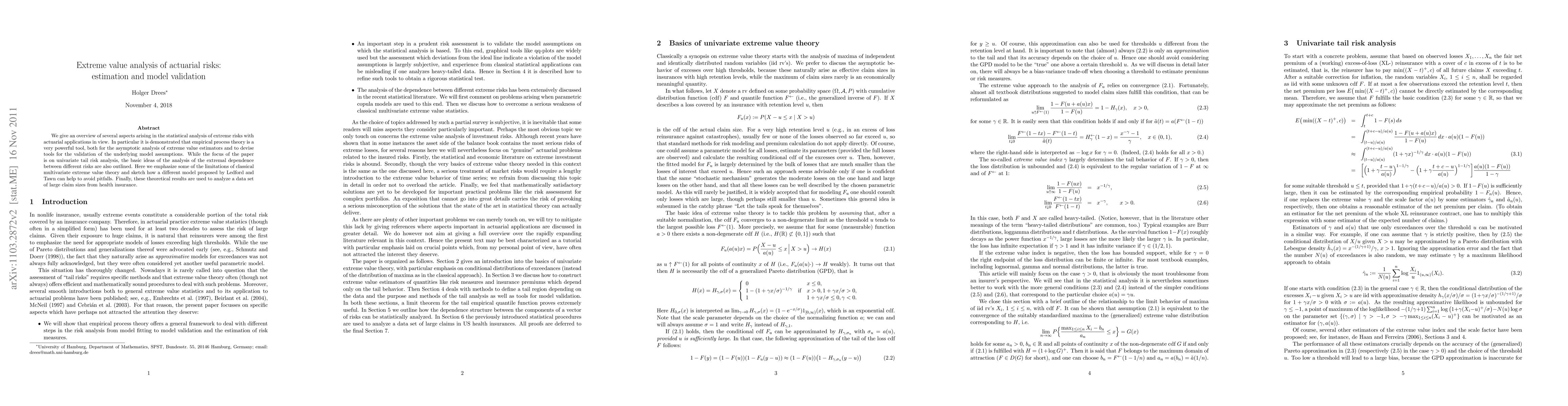 This paper explores the statistical analysis of extreme risks in actuarial science, emphasizing the use of empirical process theory for the validation of extreme value models. It also introduces a new model by Ledford and Tawn to address the limitations of classical multivariate extreme value theory, and applies these methods to analyze large claim sizes from health insurance data.