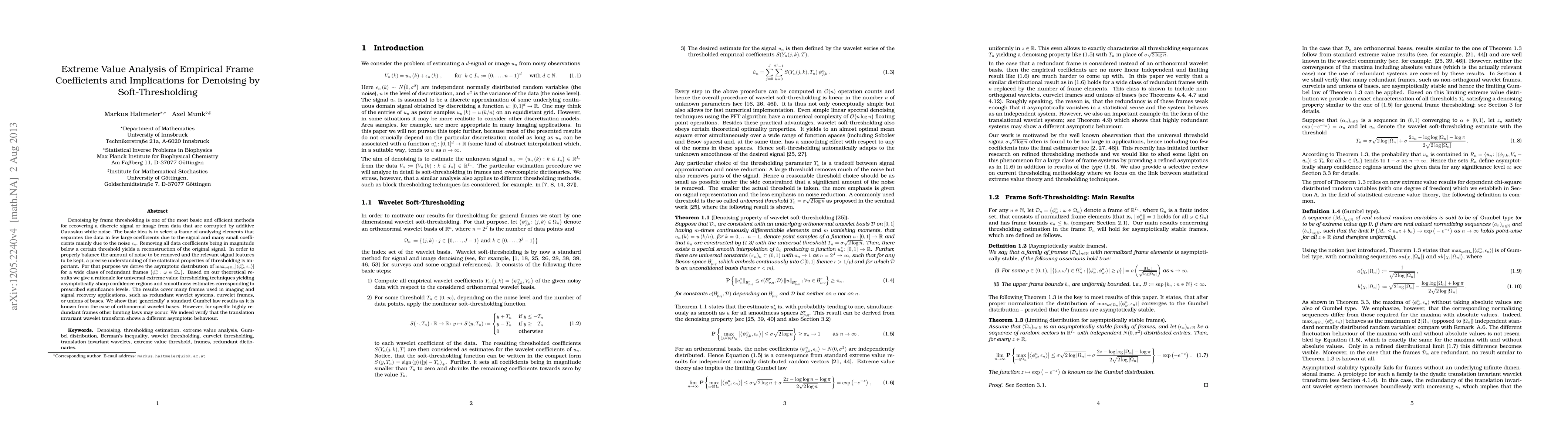 Denoising by frame thresholding is one of the most basic and efficient methods for recovering a discrete signal or image from data that are corrupted by additive Gaussian white noise. The basic idea is to select a frame of analyzing elements that separates the data in few large coefficients due to the signal and many small coefficients mainly due to the noise \epsilon_n. Removing all data coefficients being in magnitude below a certain threshold yields a reconstruction of the original signal. In order to properly balance the amount of noise to be removed and the relevant signal features to be kept, a precise understanding of the statistical properties of thresholding is important. For that purpose we derive the asymptotic distribution of max_{\omega \in \Omega_n} |<\phi_\omega^n,\epsilon_n>| for a wide class of redundant frames (\phi_\omega^n: \omega \in \Omega_n}. Based on our theoretical results we give a rationale for universal extreme value thresholding techniques yielding asymptotically sharp confidence regions and smoothness estimates corresponding to prescribed significance levels. The results cover many frames used in imaging and signal recovery applications, such as redundant wavelet systems, curvelet frames, or unions of bases. We show that `generically' a standard Gumbel law results as it is known from the case of orthonormal wavelet bases. However, for specific highly redundant frames other limiting laws may occur. We indeed verify that the translation invariant wavelet transform shows a different asymptotic behaviour.