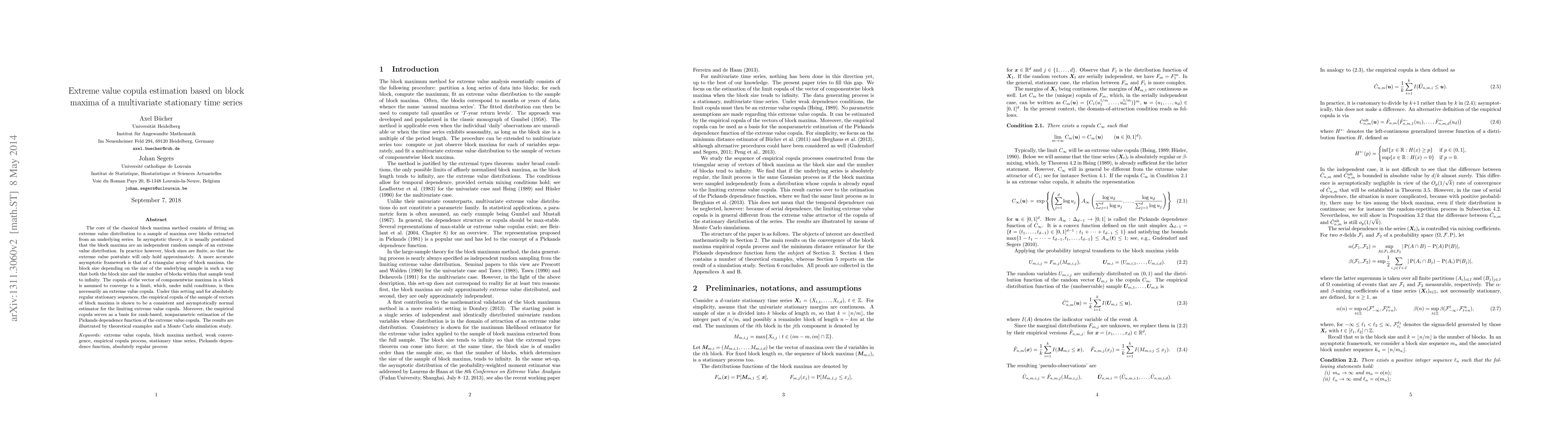 This paper develops a method for estimating extreme value copulas based on block maxima from multivariate stationary time series, showing that the empirical copula of block maxima is a consistent and asymptotically normal estimator. It also introduces a rank-based, nonparametric approach for estimating the Pickands dependence function, validated through theoretical examples and Monte Carlo simulations.