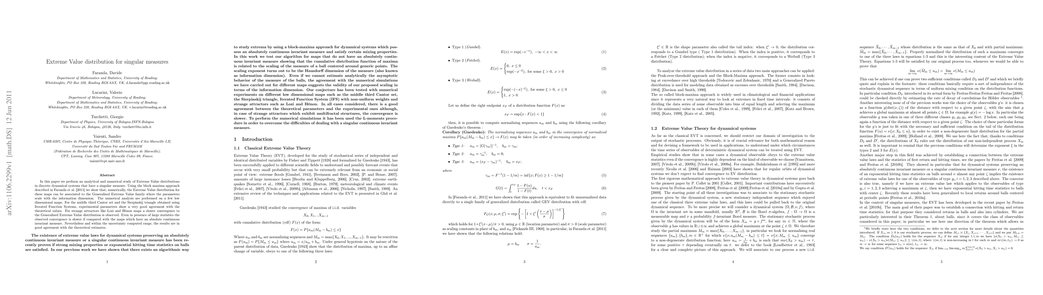 In this paper we perform an analytical and numerical study of Extreme Value distributions in discrete dynamical systems that have a singular measure. Using the block maxima approach described in Faranda et al. [2011] we show that, numerically, the Extreme Value distribution for these maps can be associated to the Generalised Extreme Value family where the parameters scale with the information dimension. The numerical analysis are performed on a few low dimensional maps. For the middle third Cantor set and the Sierpinskij triangle obtained using Iterated Function Systems, experimental parameters show a very good agreement with the theoretical values. For strange attractors like Lozi and H\`enon maps a slower convergence to the Generalised Extreme Value distribution is observed. Even in presence of large statistics the observed convergence is slower if compared with the maps which have an absolute continuous invariant measure. Nevertheless and within the uncertainty computed range, the results are in good agreement with the theoretical estimates.